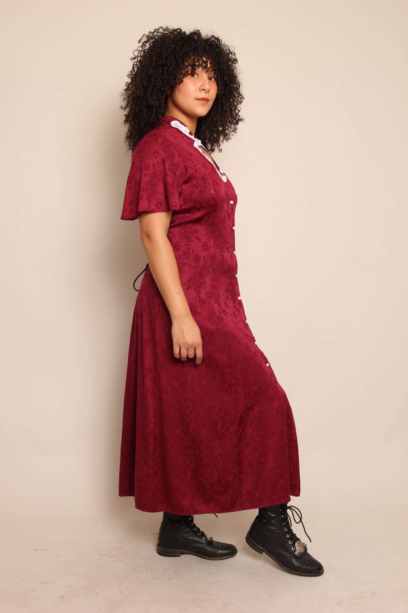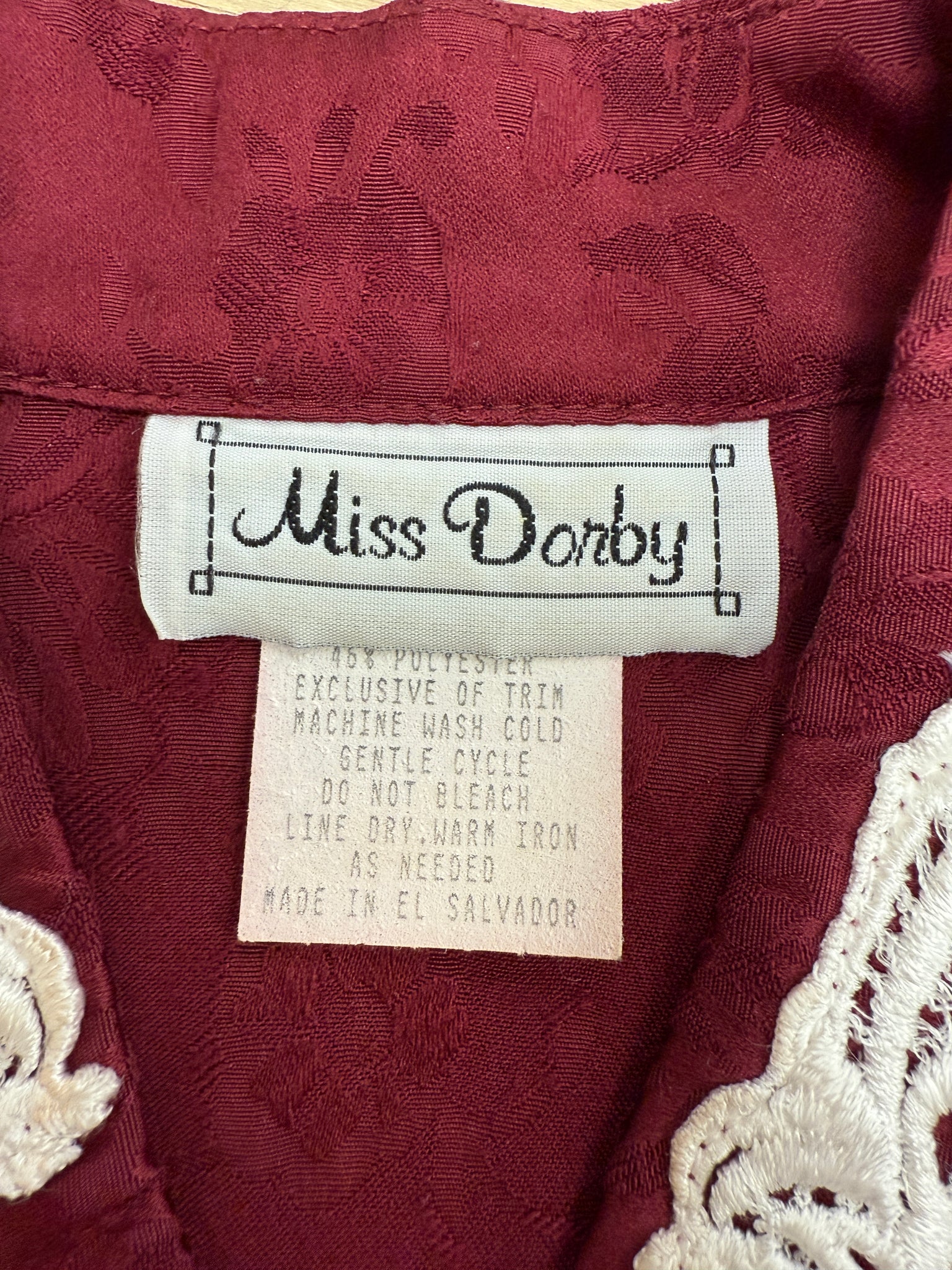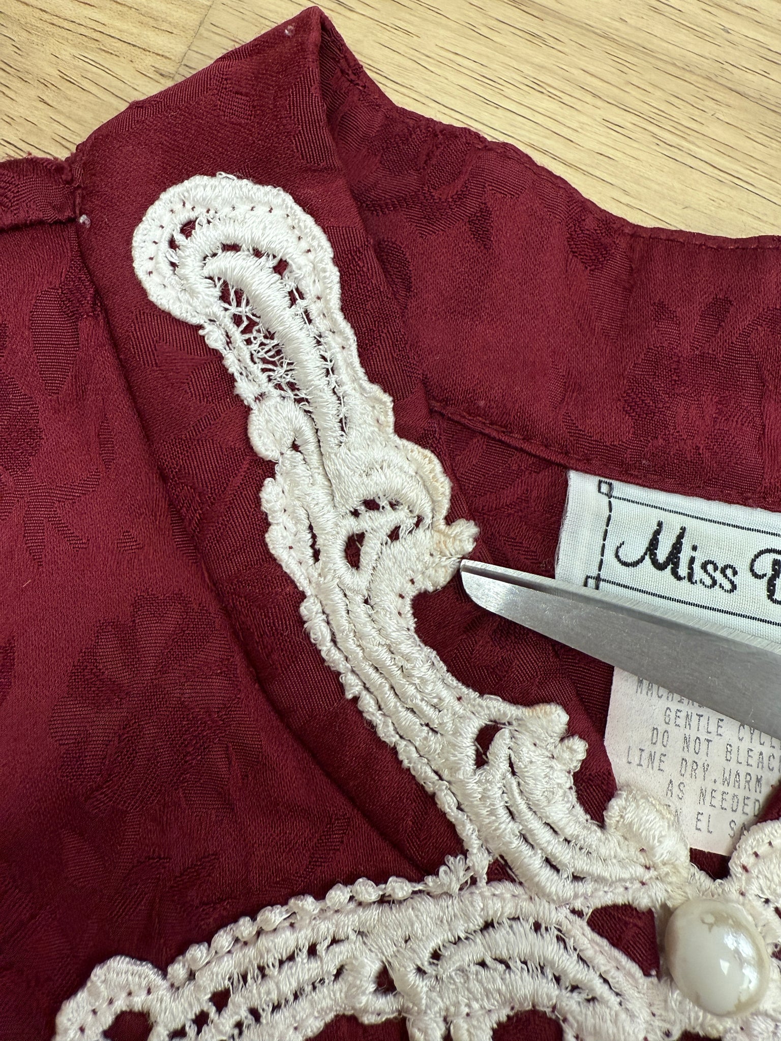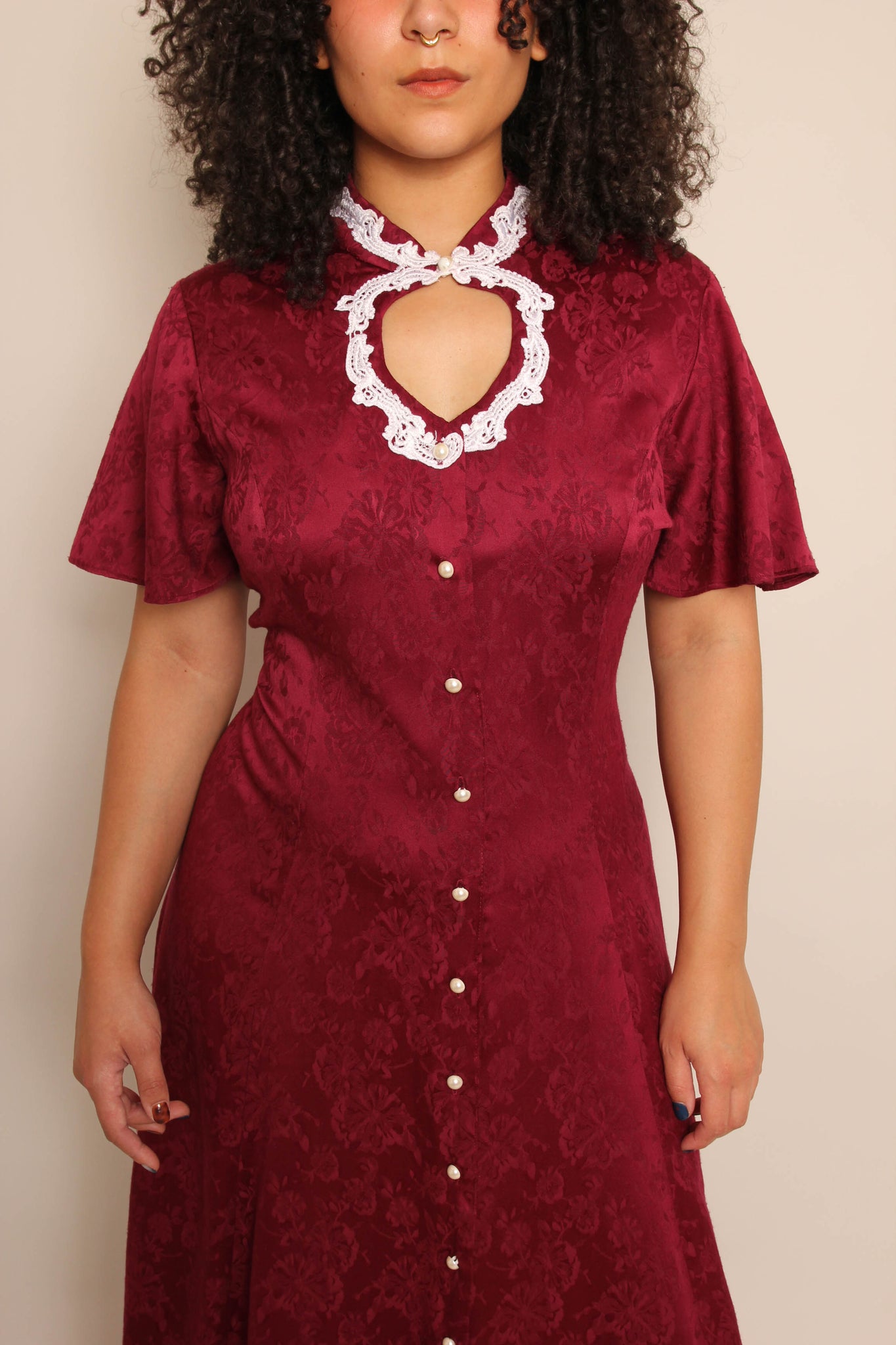 - Keyhole cut-out at the neck with lace trim and a pearl button closure