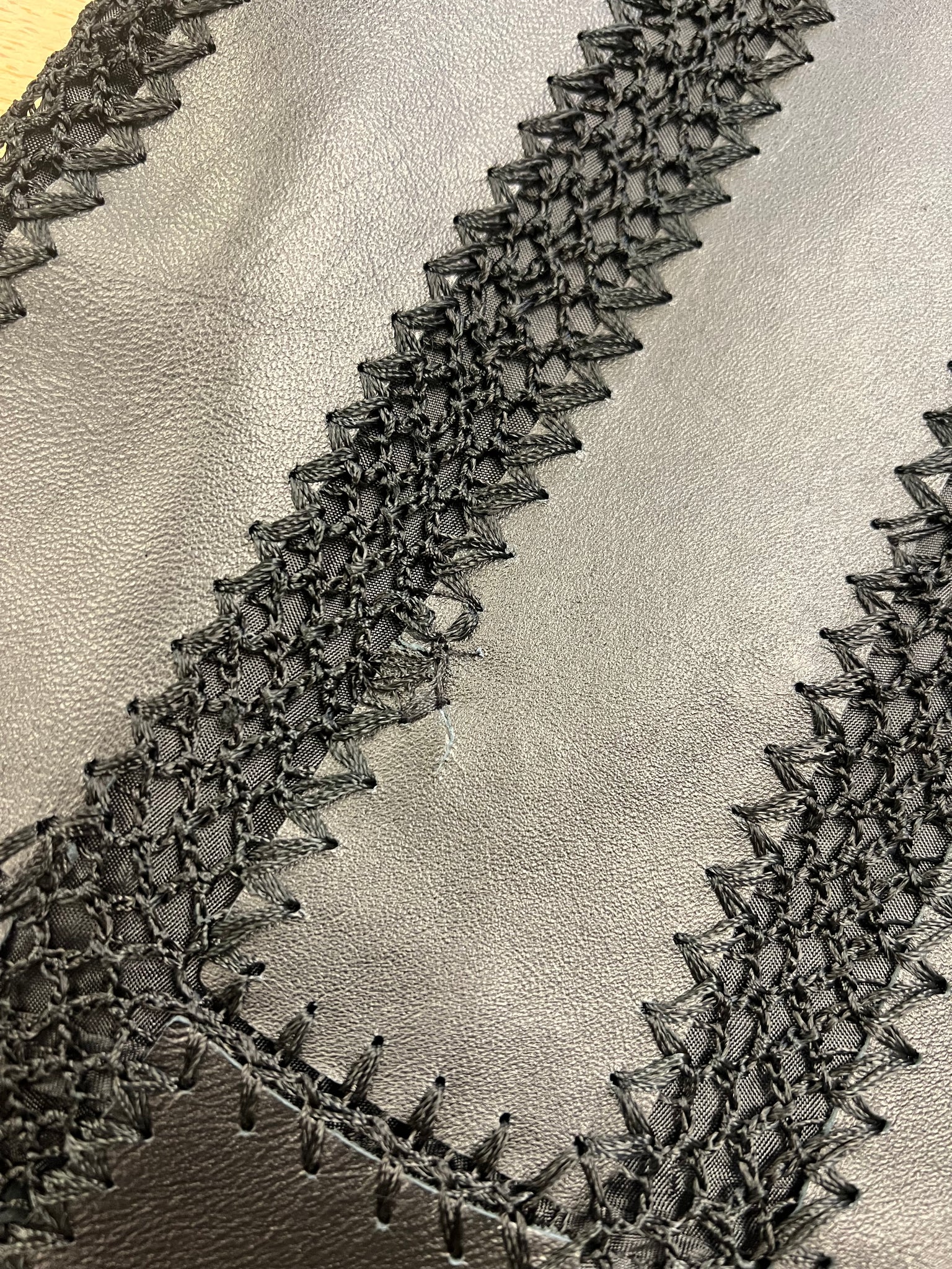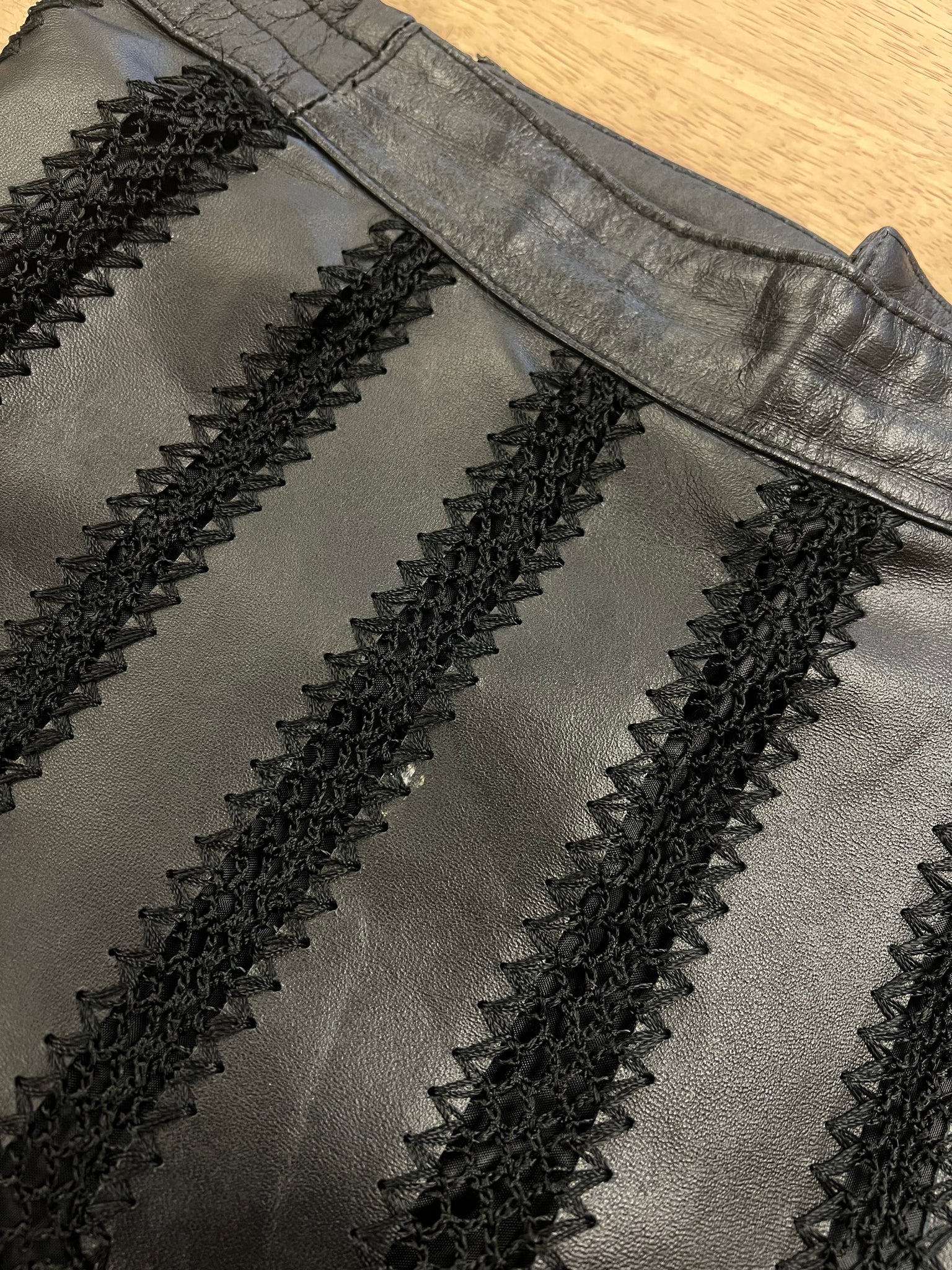 material: feels like genuine leather, lace, acetate lining, zipper, elastic, snap button