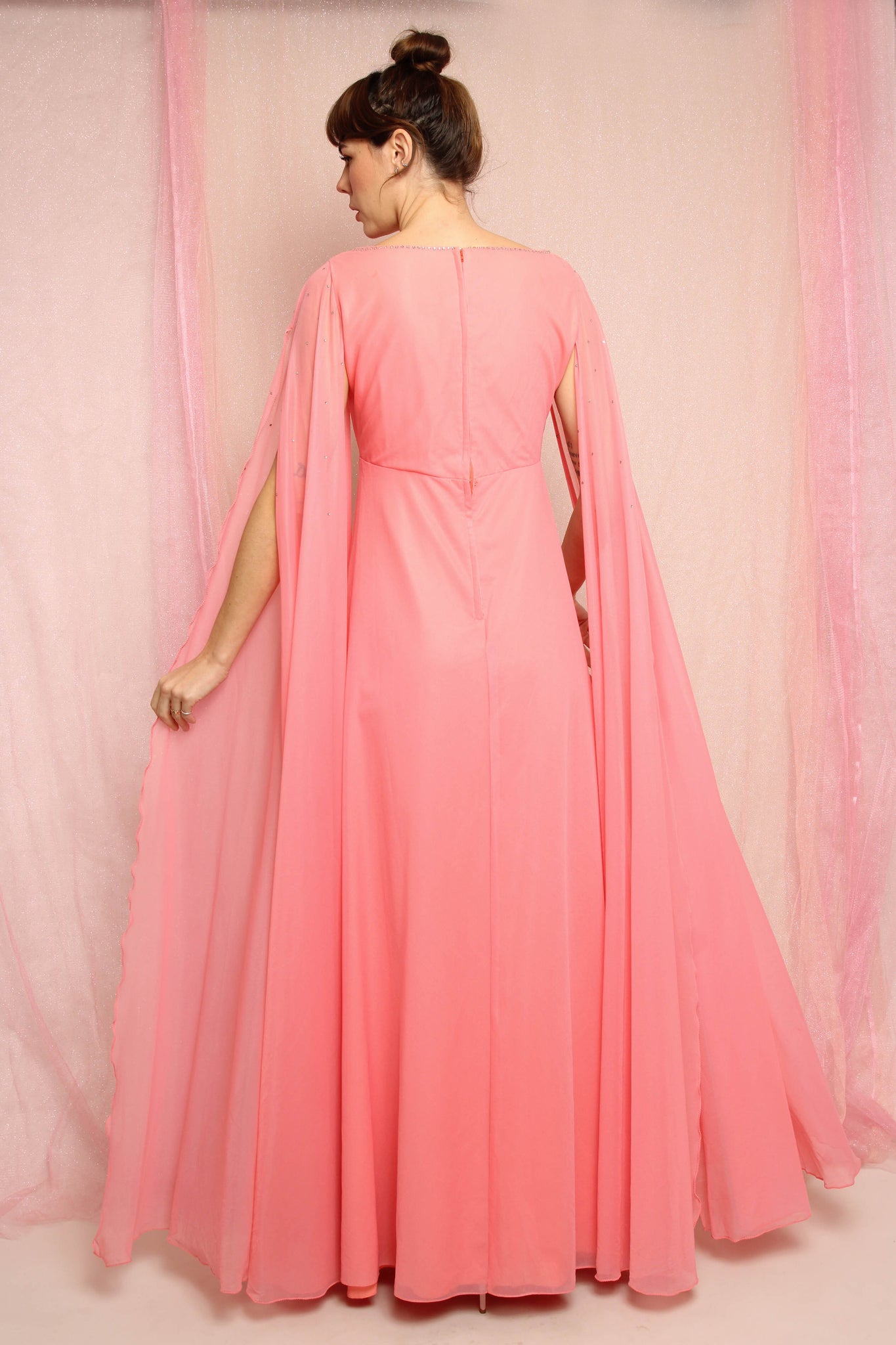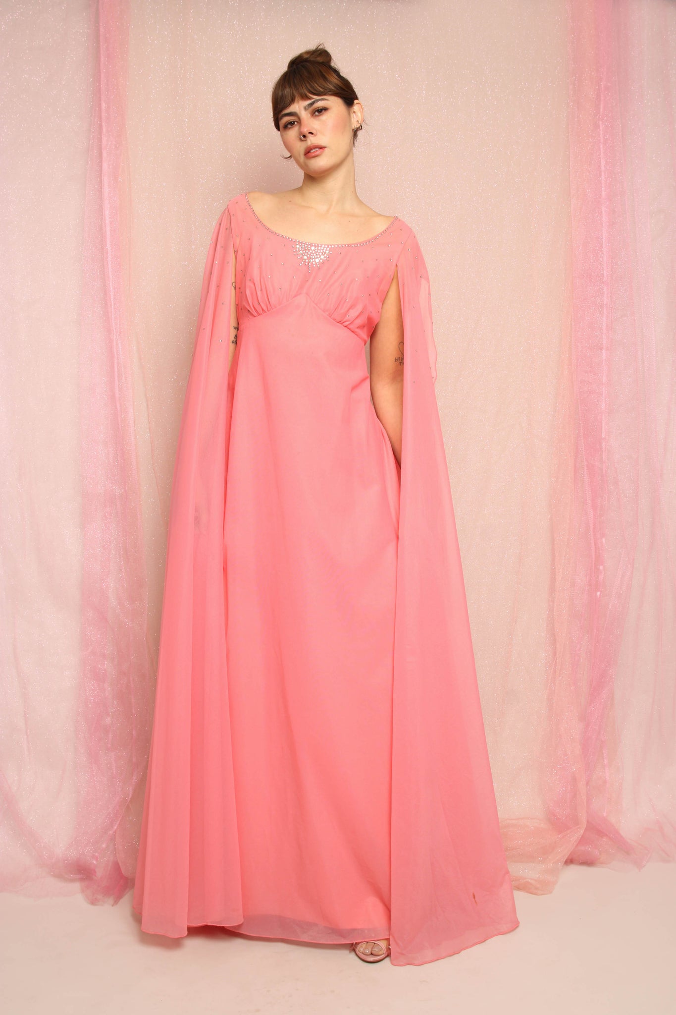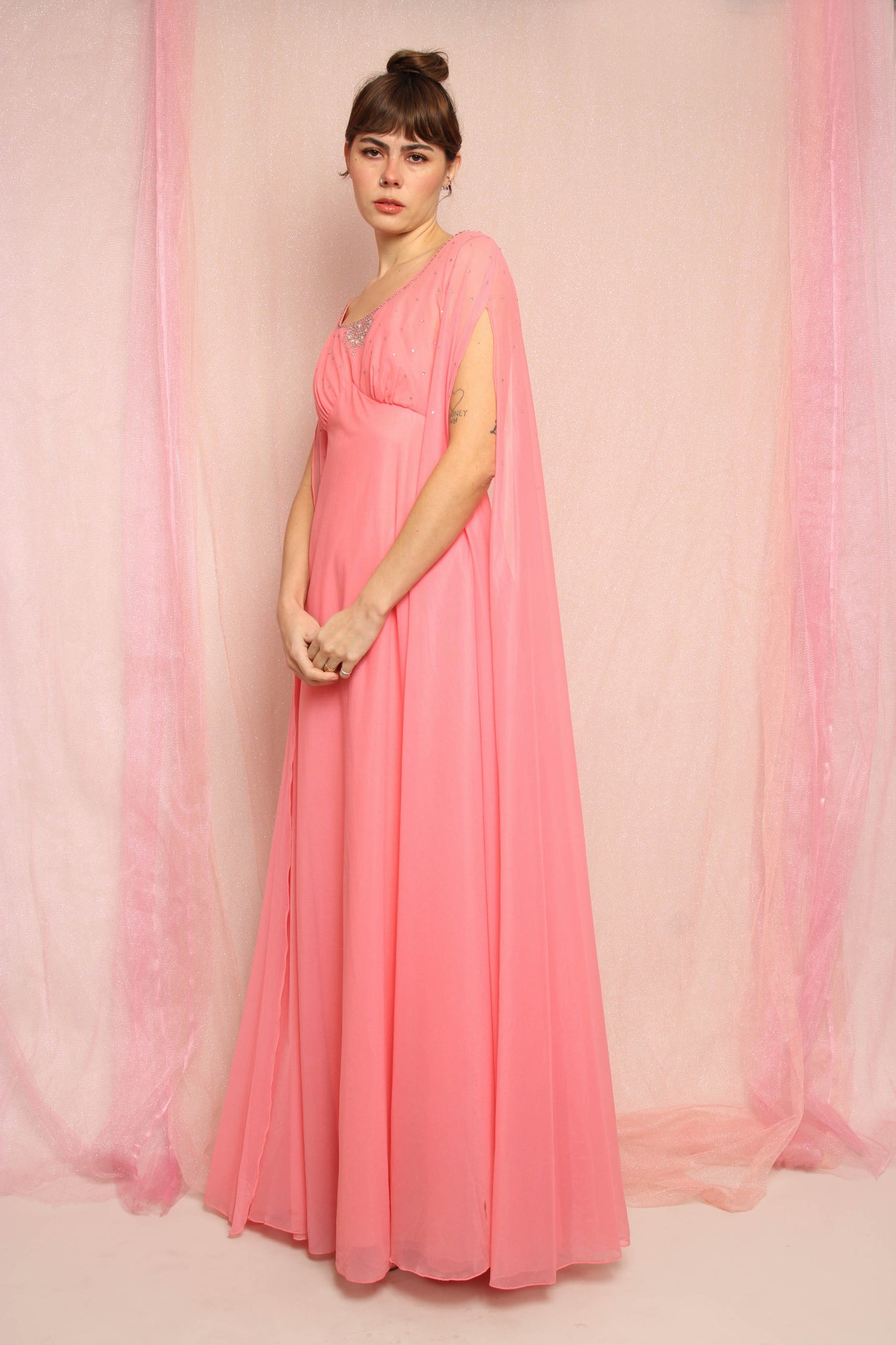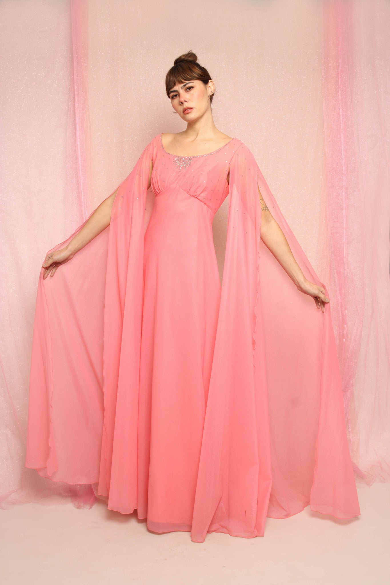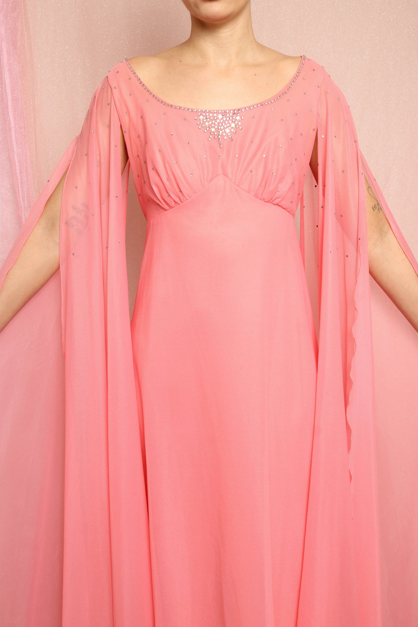 - Dramatic chiffon side sashes on the shoulders cover the arms like floor length sleeves
