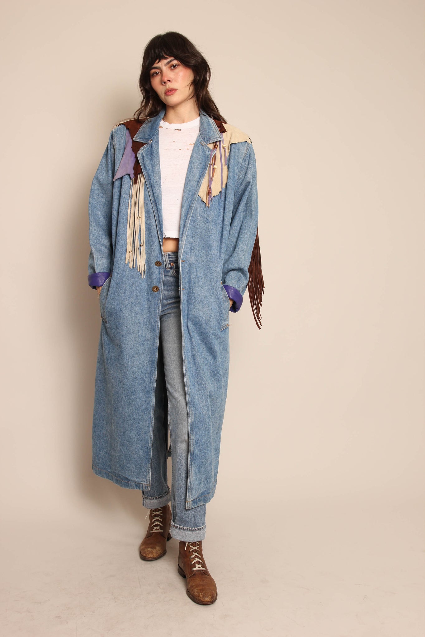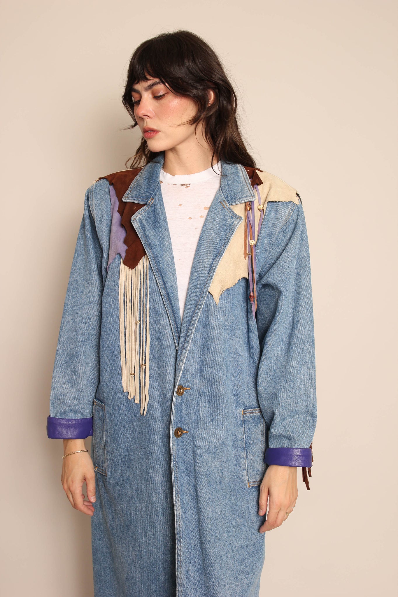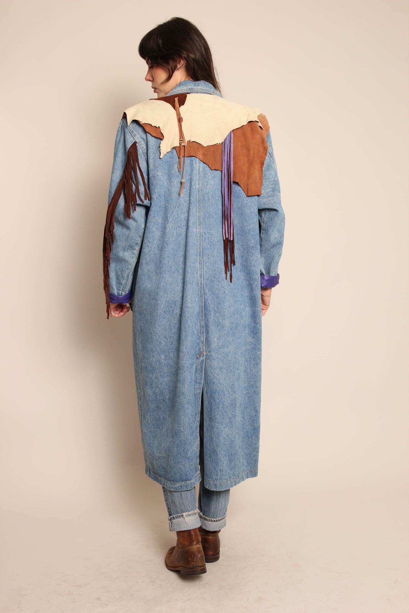 - Asymmetric suede leather and fringe accents