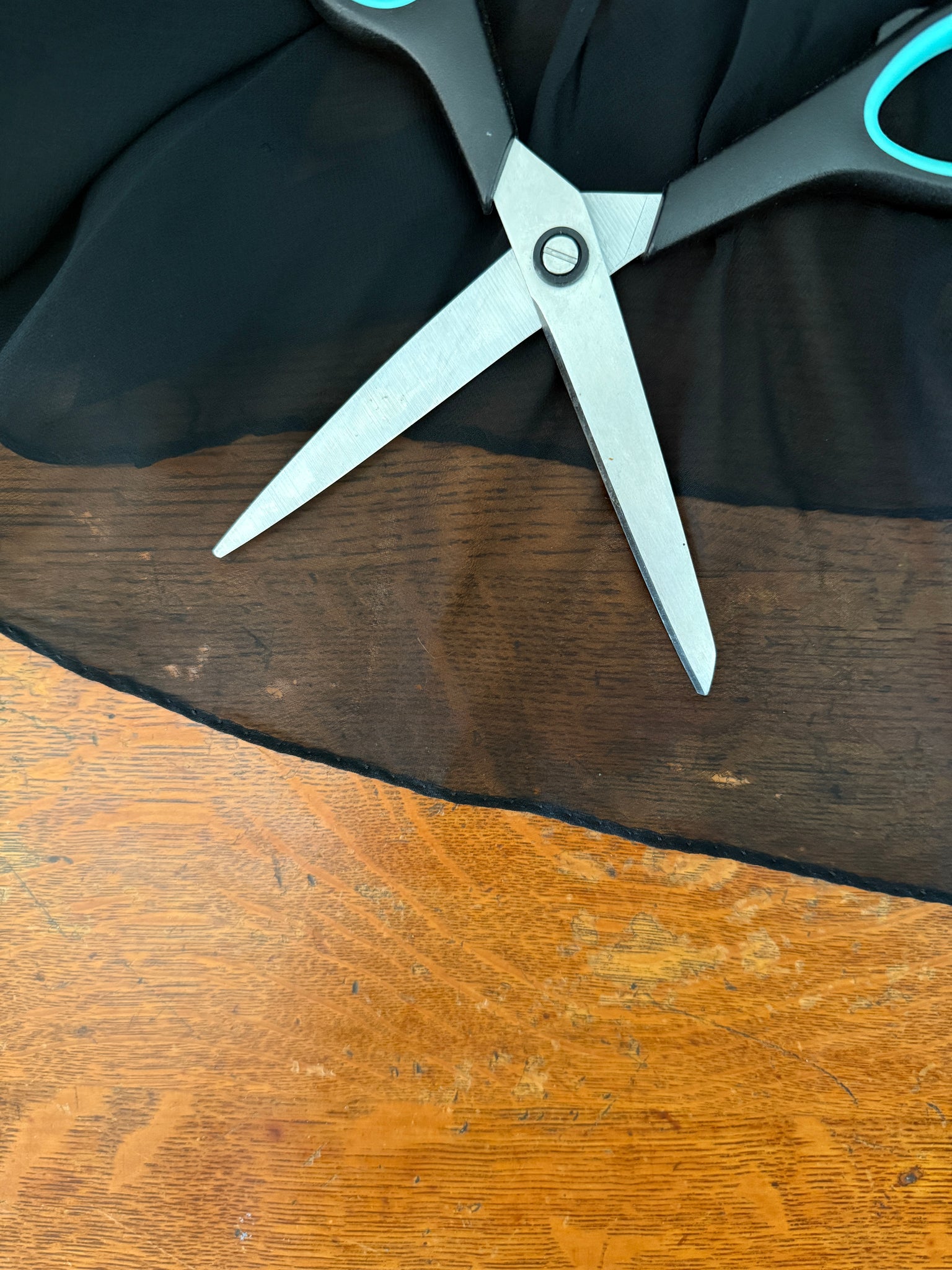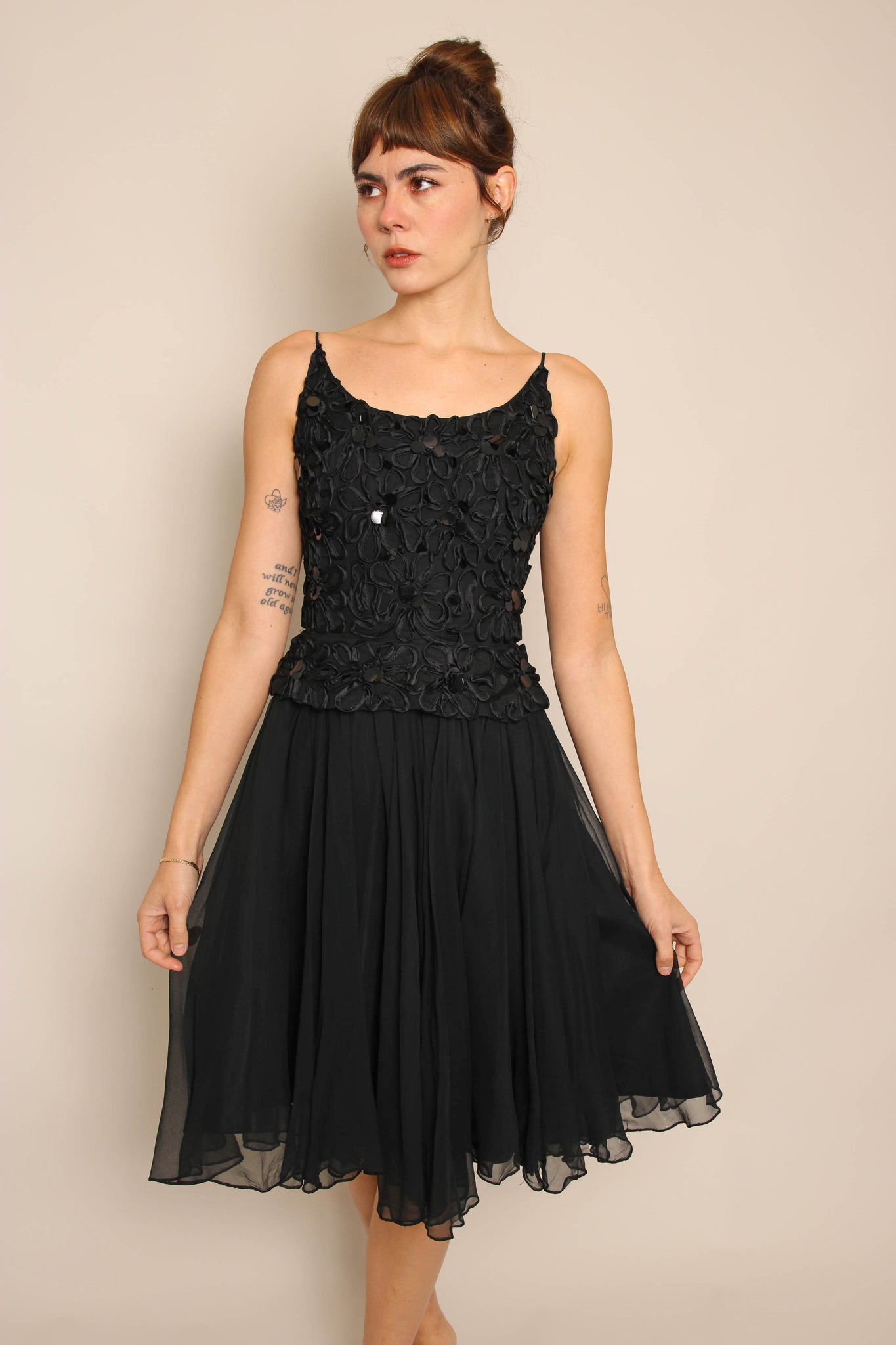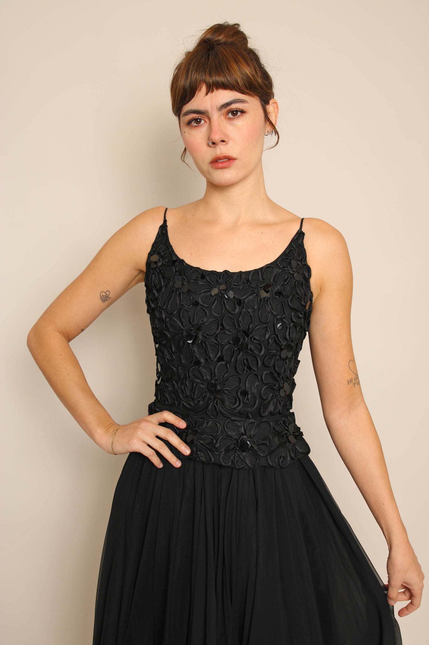 Good vintage condition: zipper works and zips all the way up and down but is a little fussy; small area of tiny holes in the chiffon along the very bottom hem of the skirt.