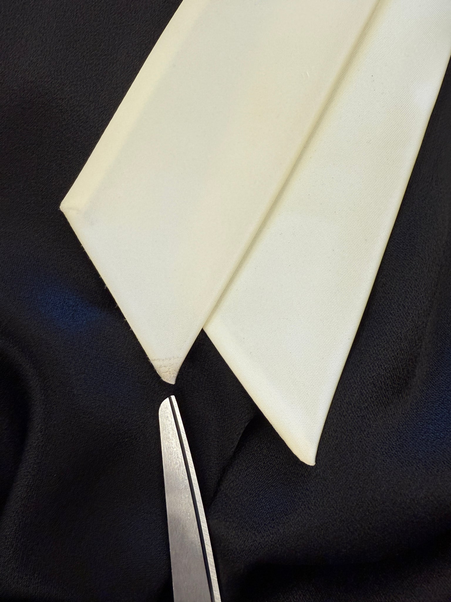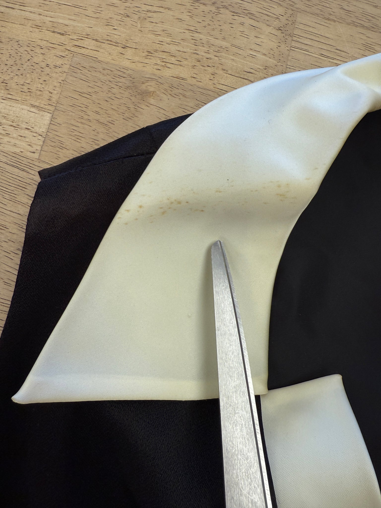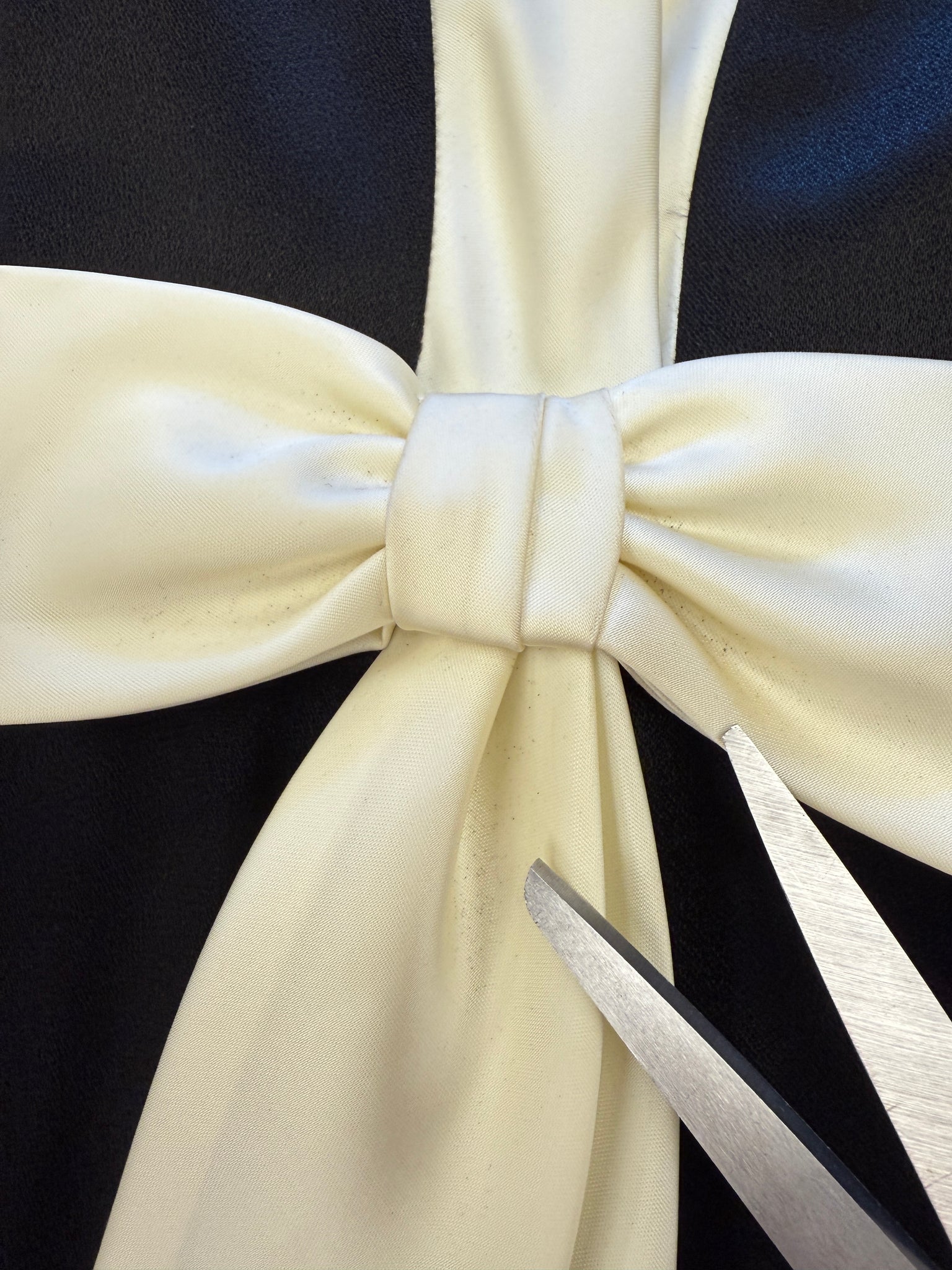 Good vintage condition: some markings across the very top of the right shoulder, super faint markings on the bow and bow tie; slight discoloration at the underarms.