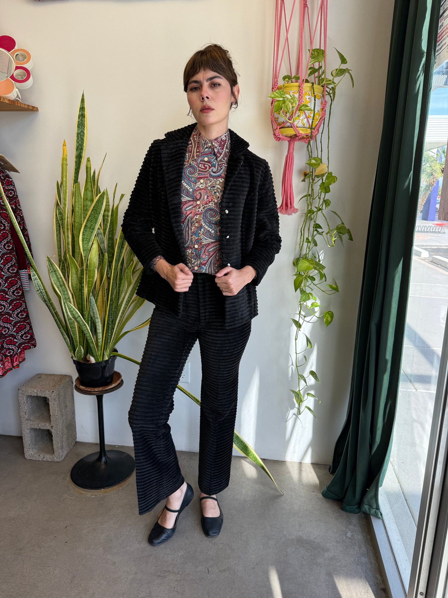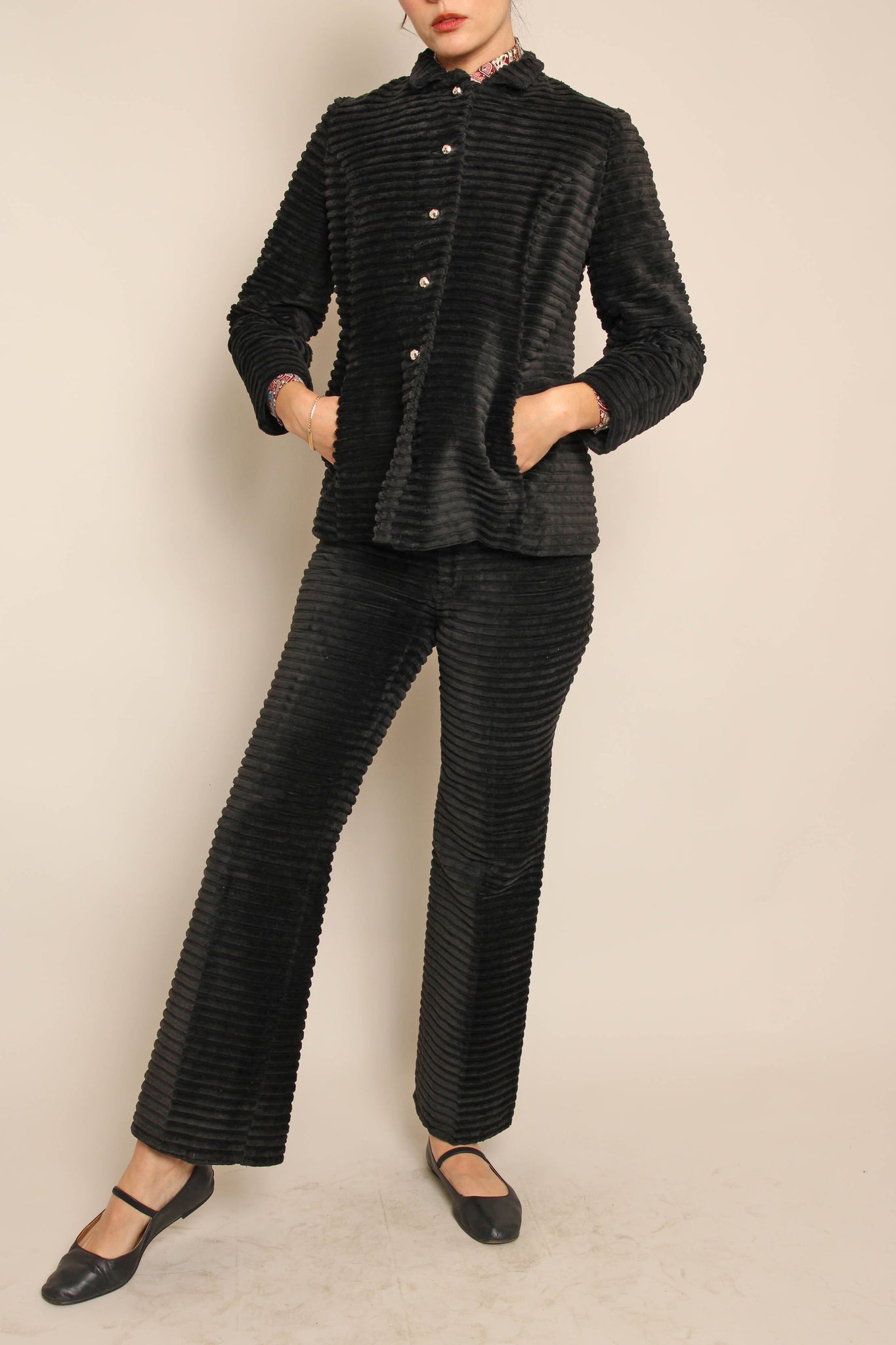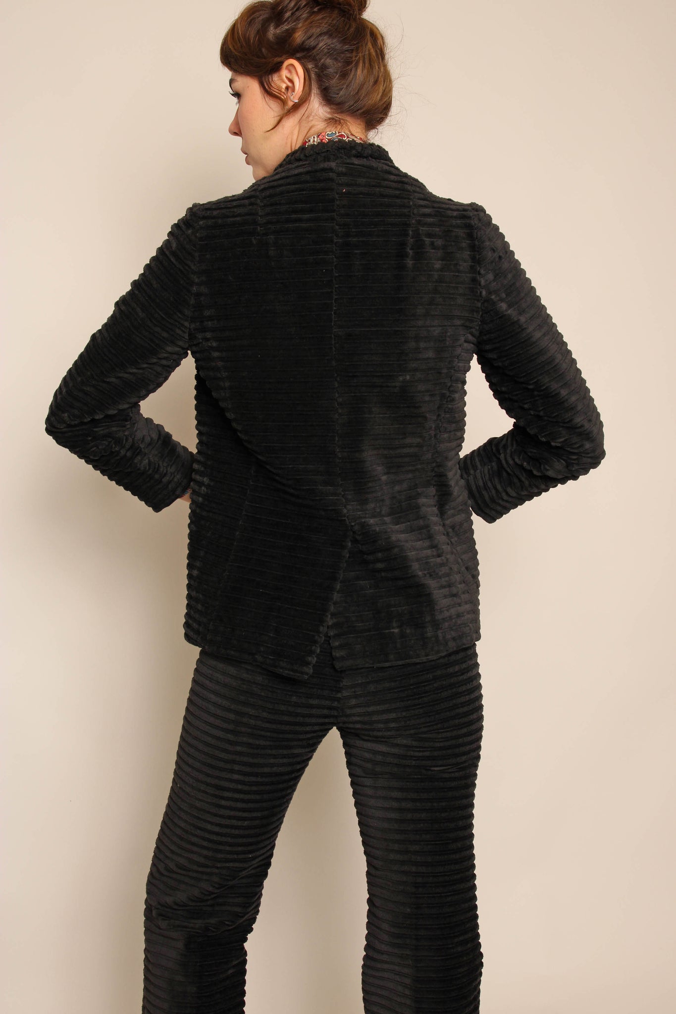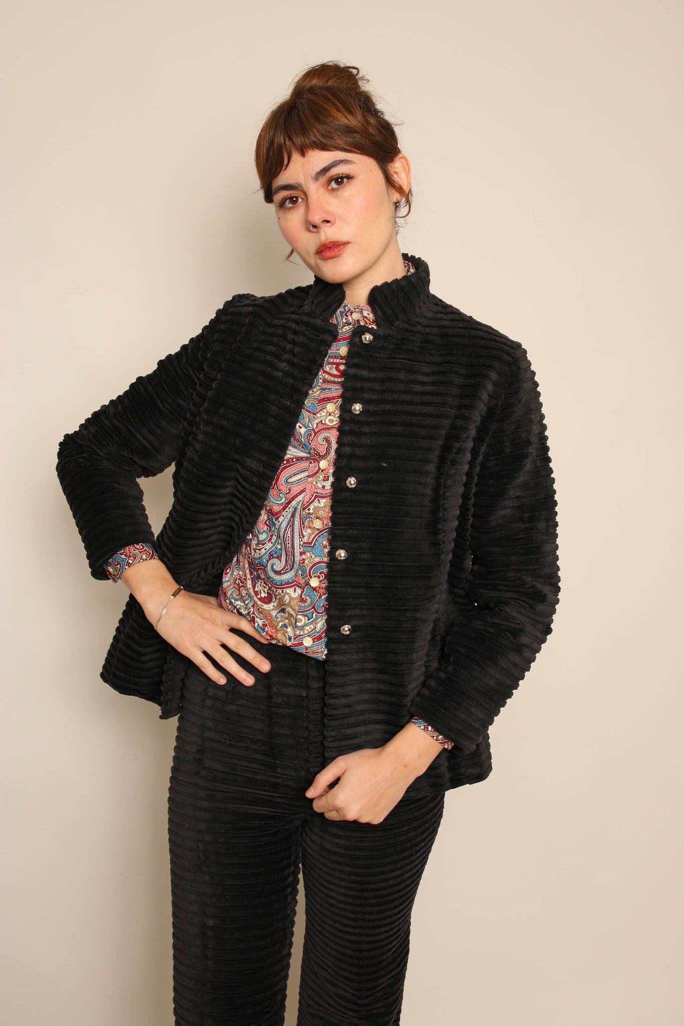 - Jacket features a mandarin collar and silver faceted buttons up the front