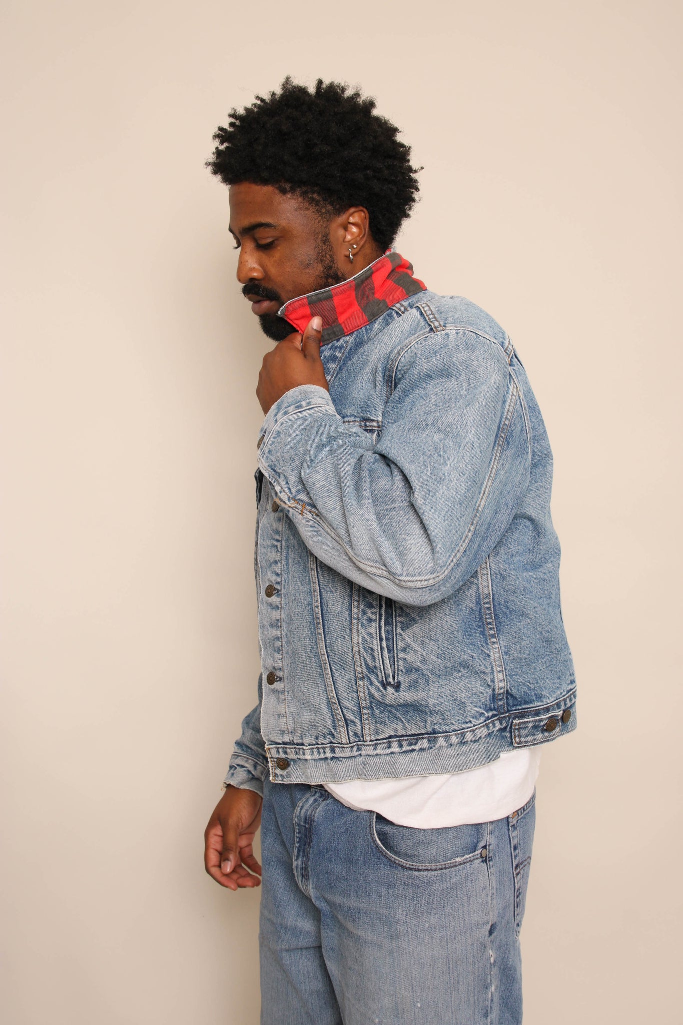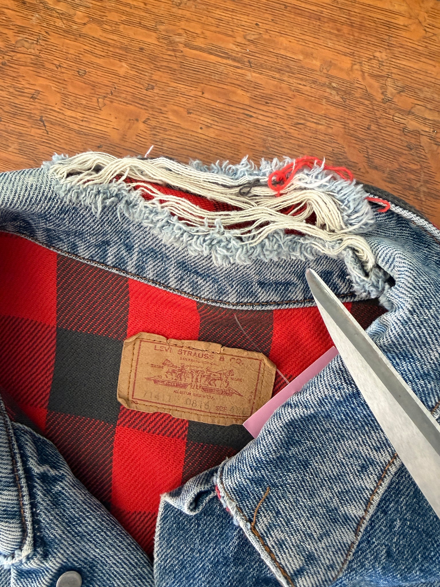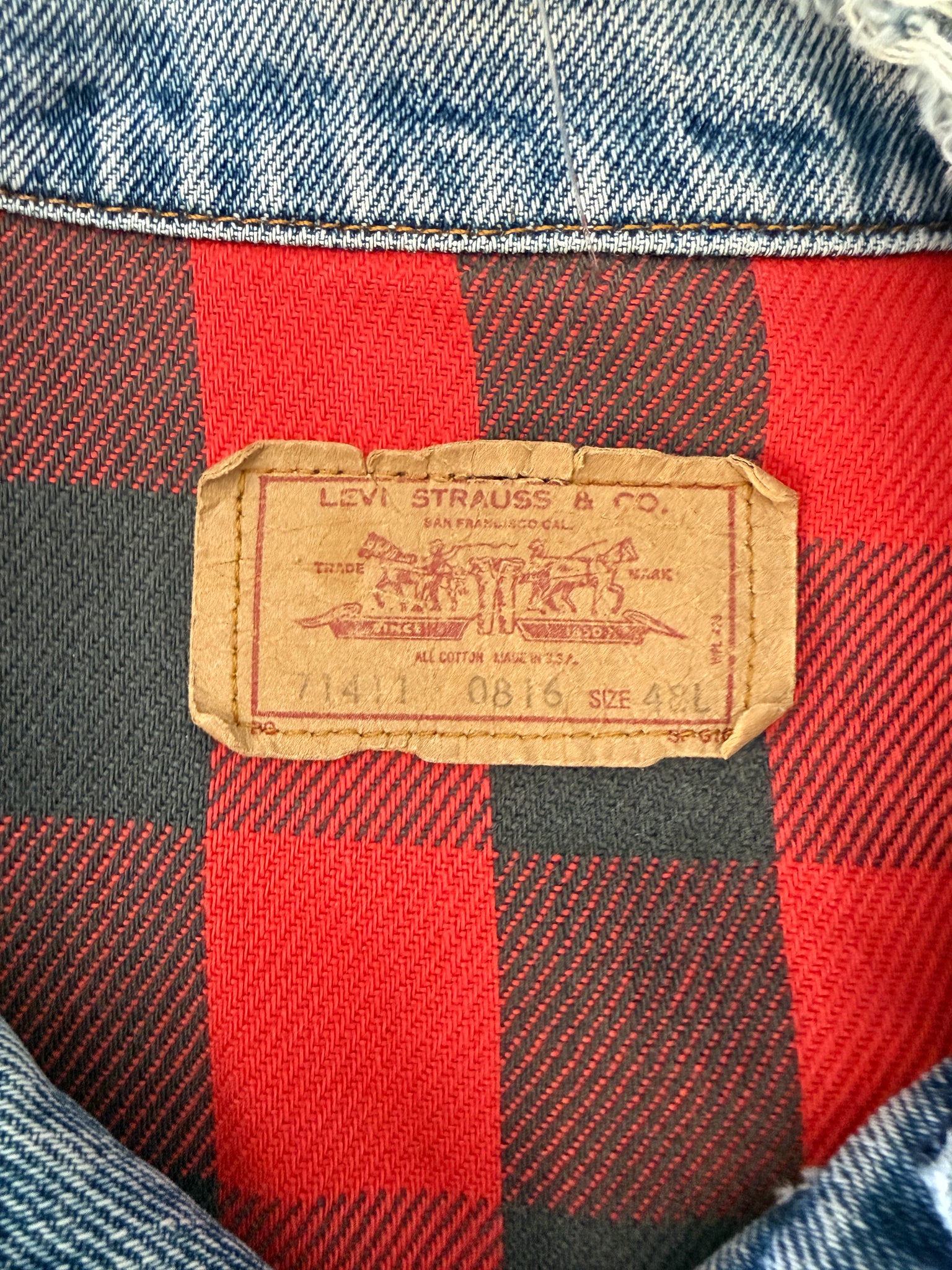 Great as-is vintage condition: small spot on left chest pocket; collar is frayed at the back of the neck; some frayed areas of the buffalo plaid inside lining.