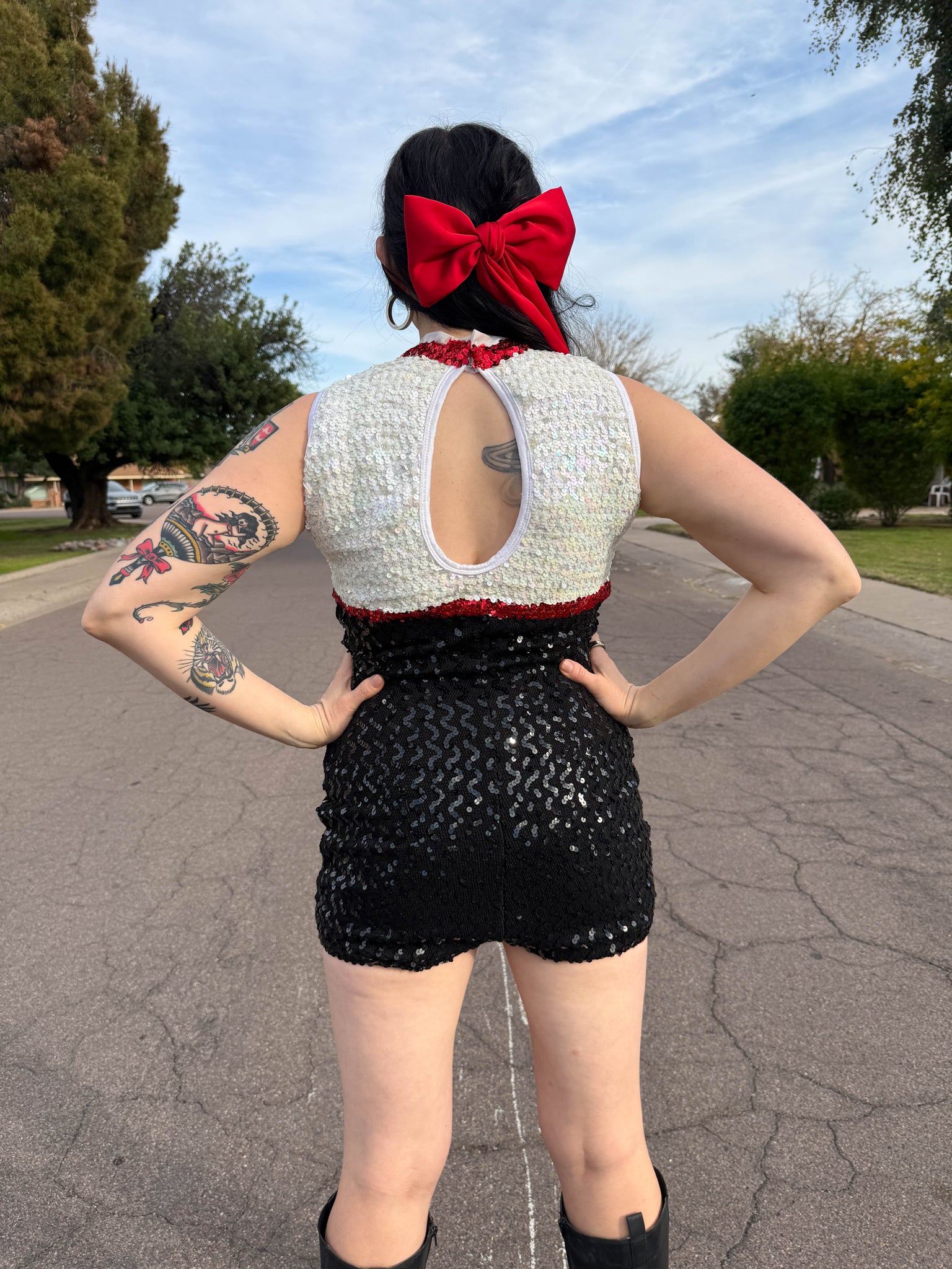 material: sequins, nylon trim, feels like an acrylic knit, hook and eye