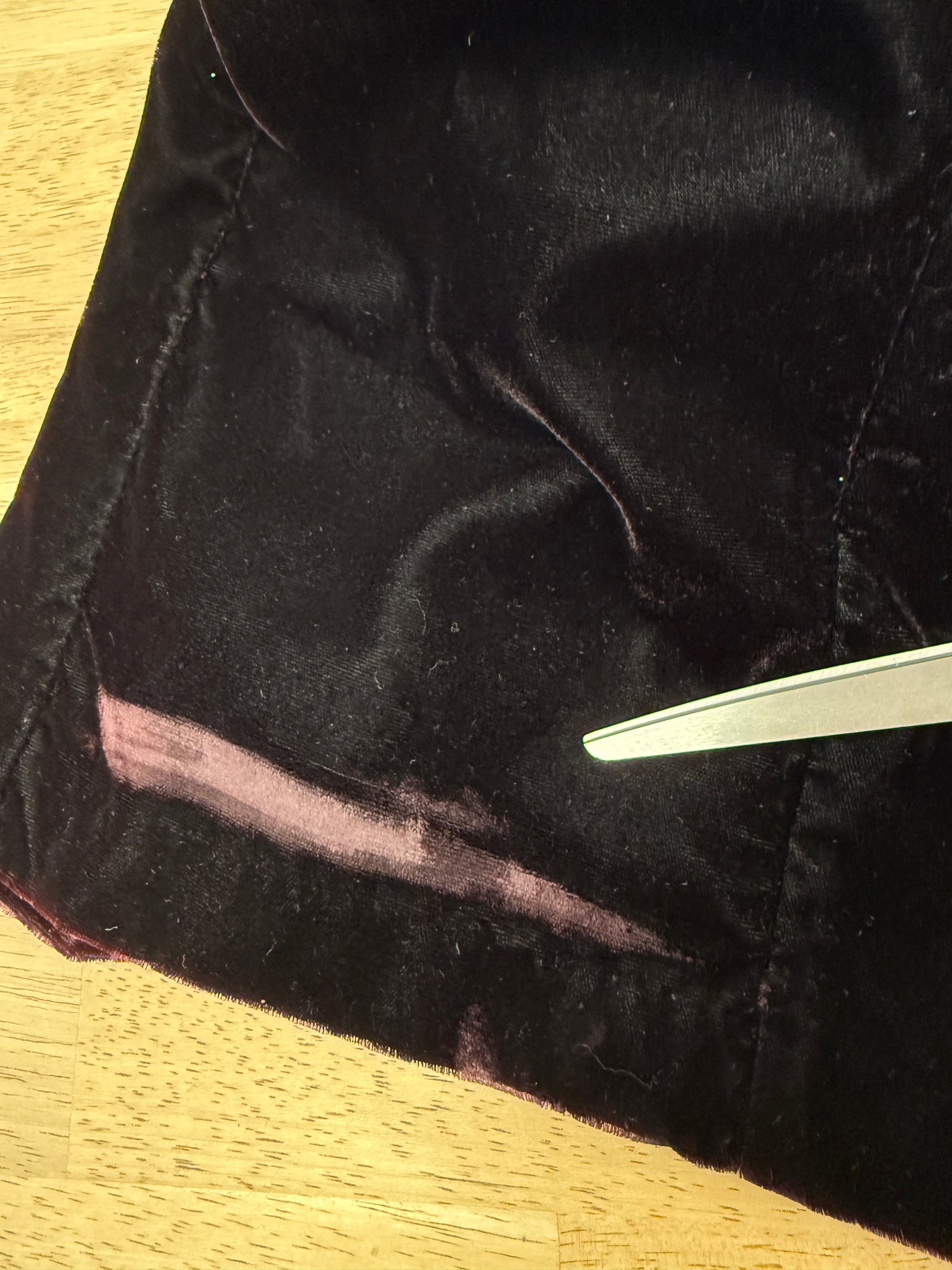 Good vintage condition: some discoloration at the underarms; some markings and a pinprick hole on the sash; very edge of the bottom hem has some minor wear in the velvet; velvet has a differing sheens depending on the angle of light, it’s not necessarily a flaw but looks different.