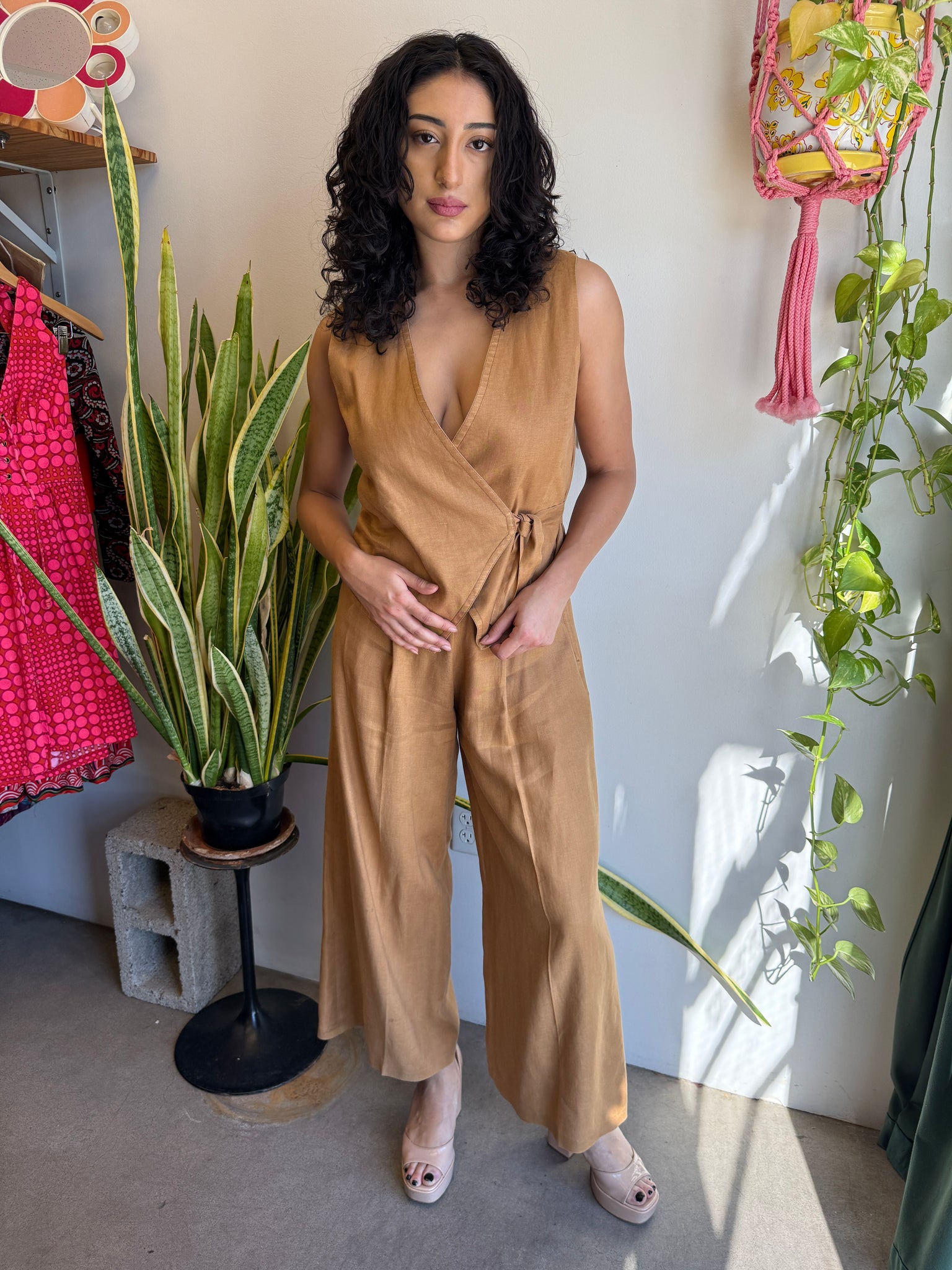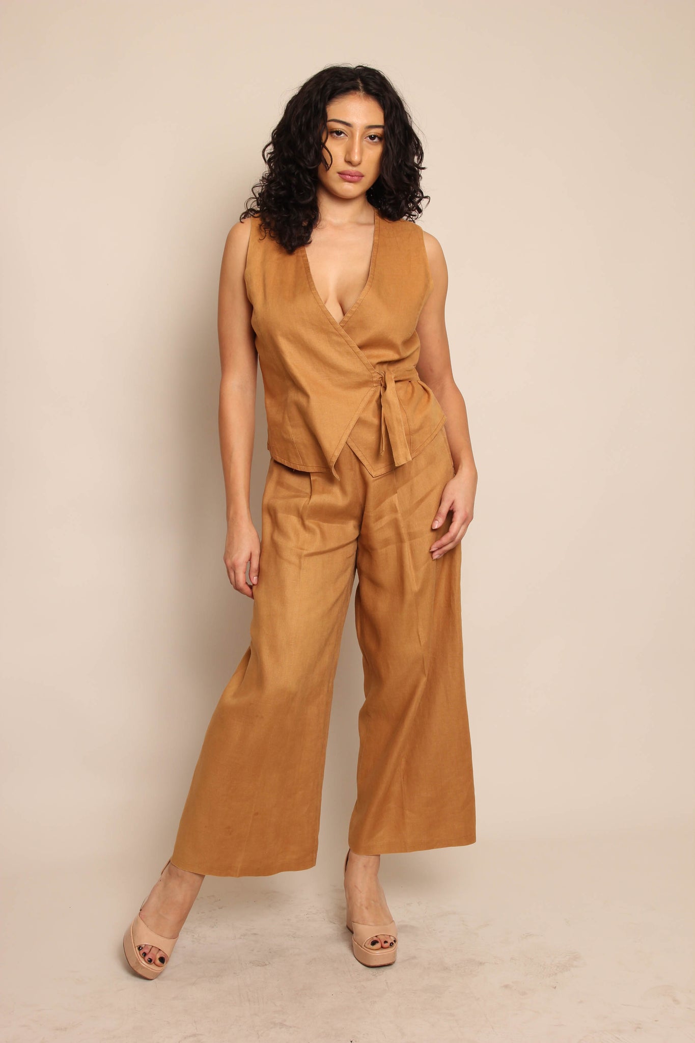- Vest features a wrap style with an internal button closure and adjustable waist tie