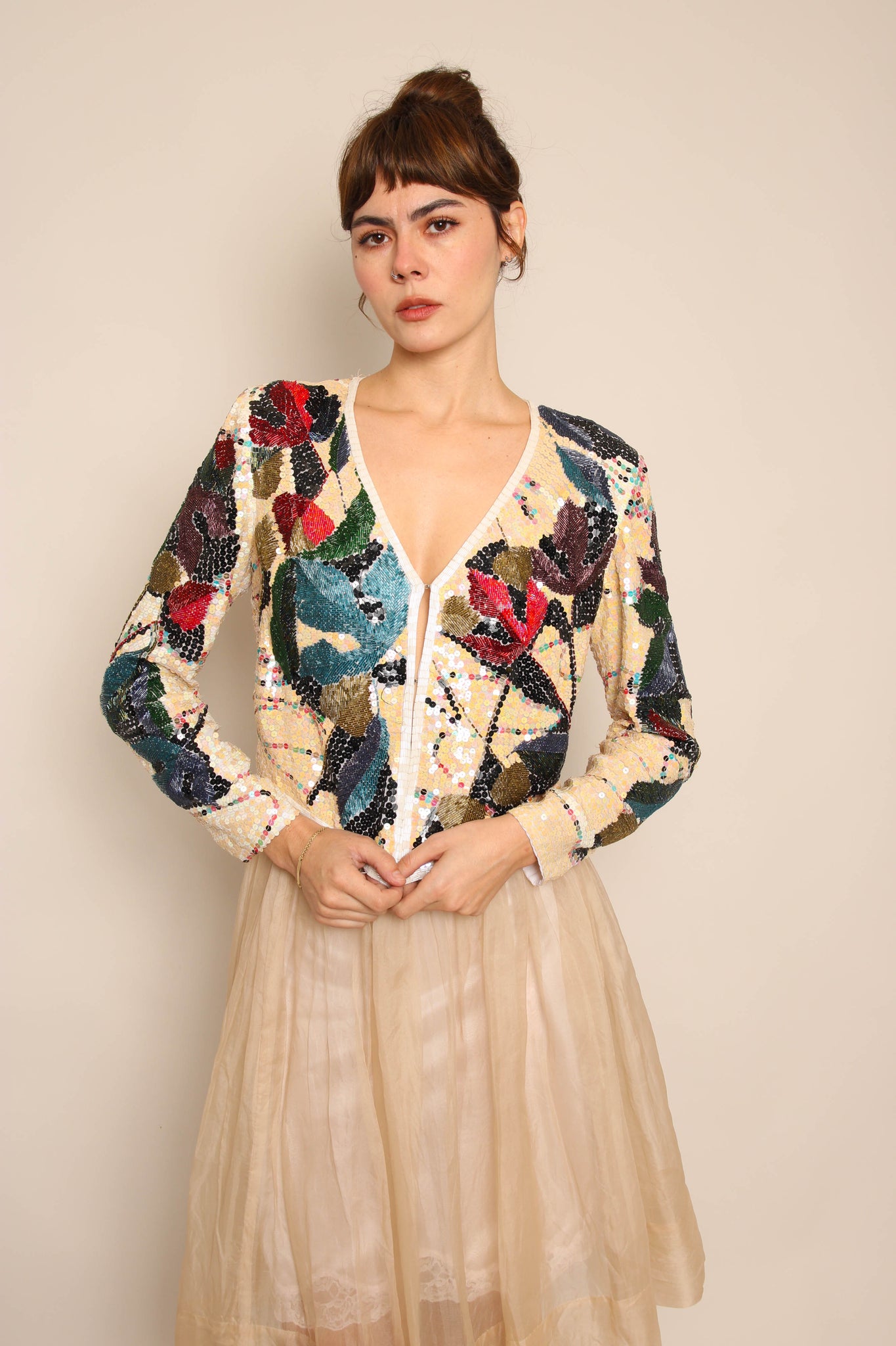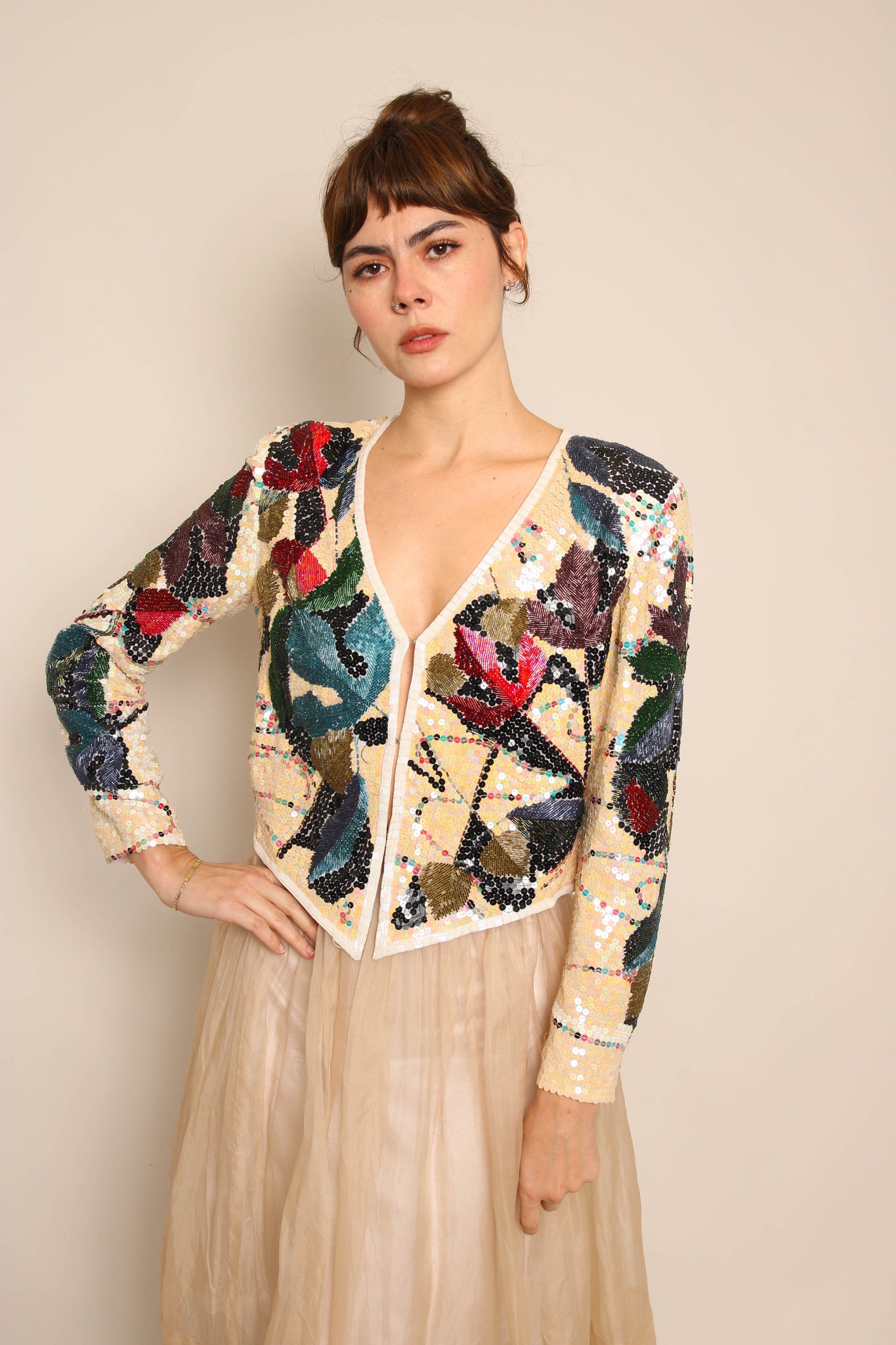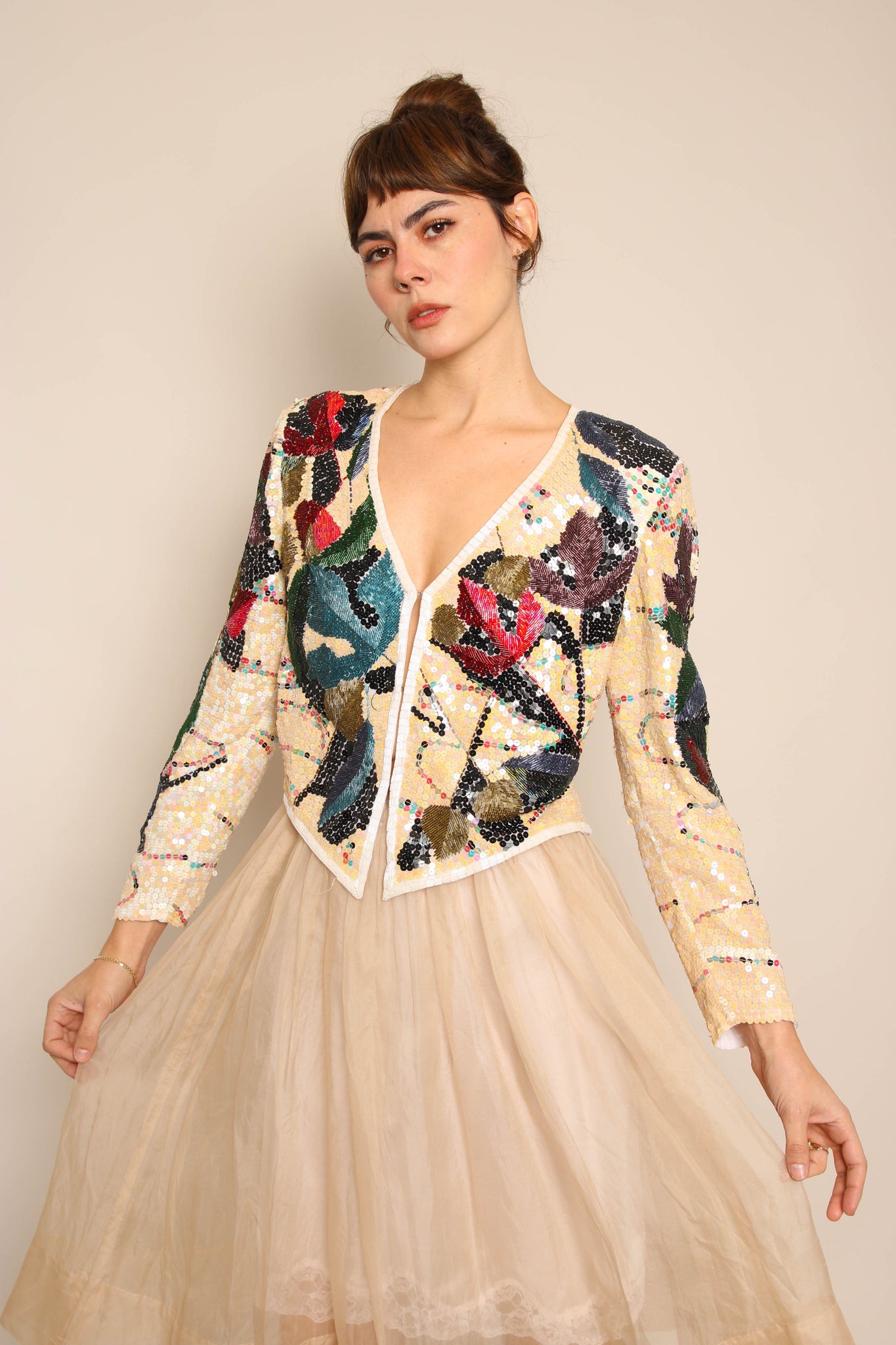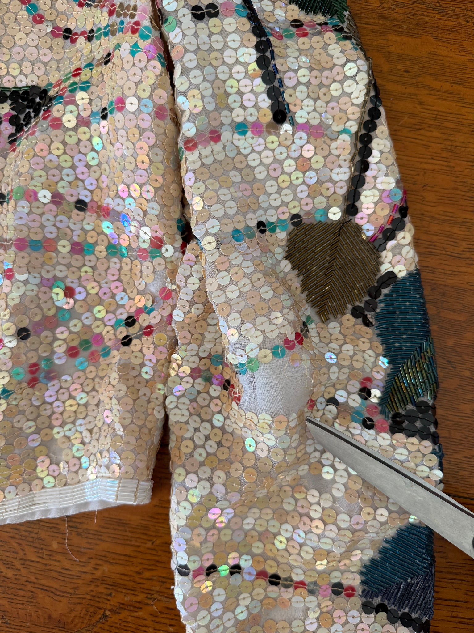Good as-is vintage condition: several sections of sequins and beads missing, see photos for details.
