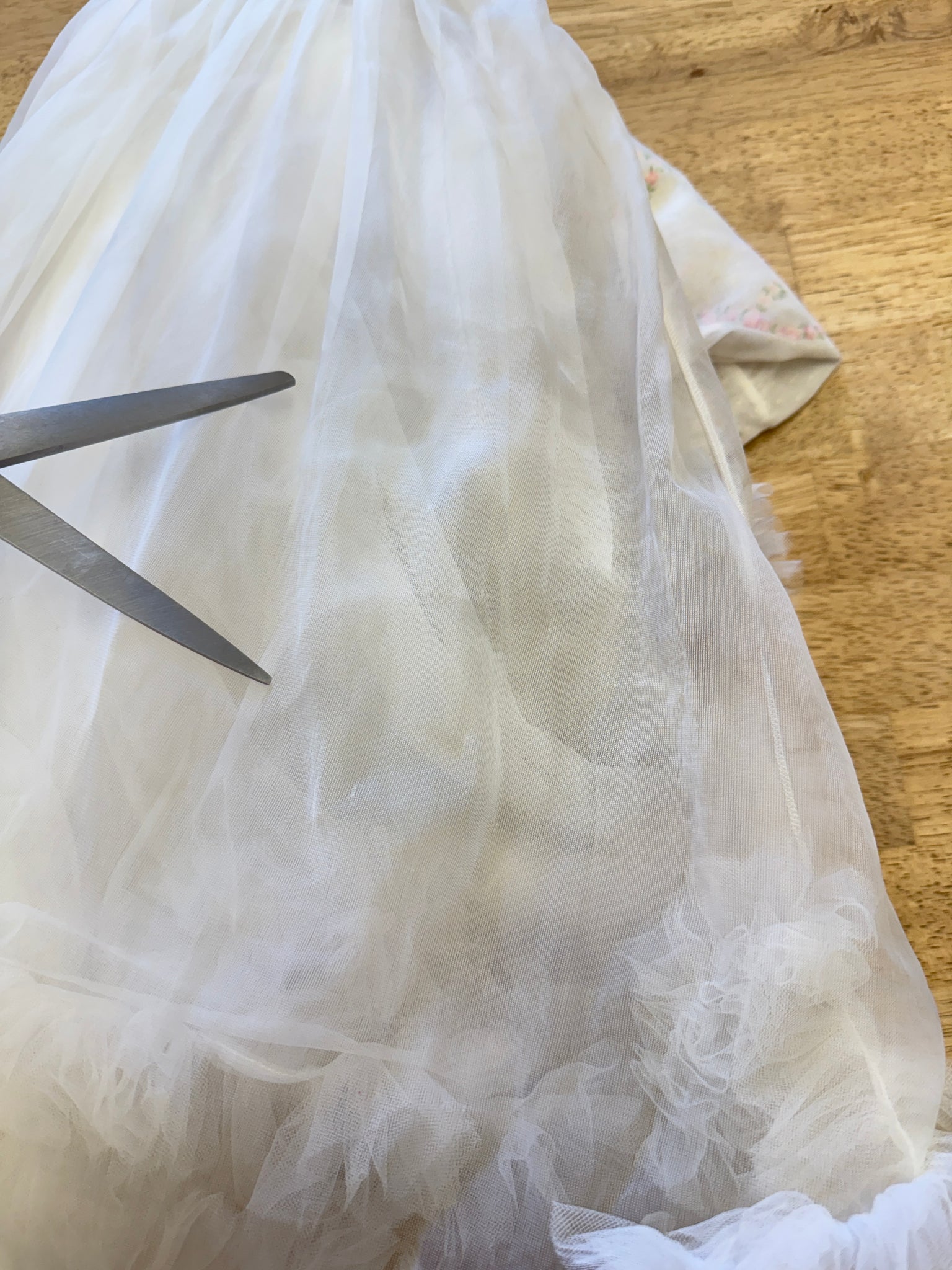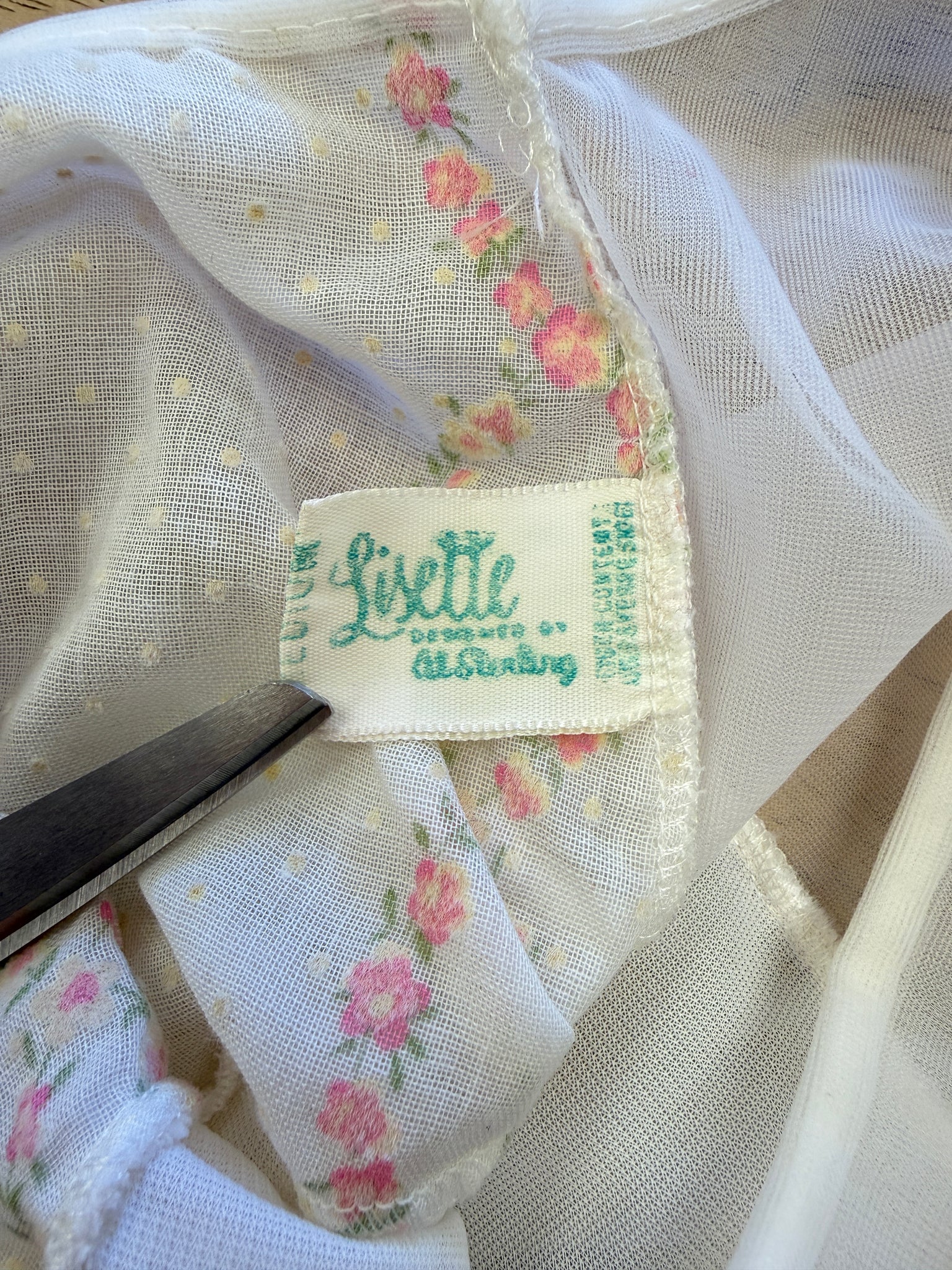 Good vintage condition: dress has belt loops but no belt present (a satin ribbon would be perfect);  a couple of pinprick holes on the slip; pinhead marking on the ruffle trim on the right side of the skirt hem; skirt of the jacket has faint discoloration throughout.
