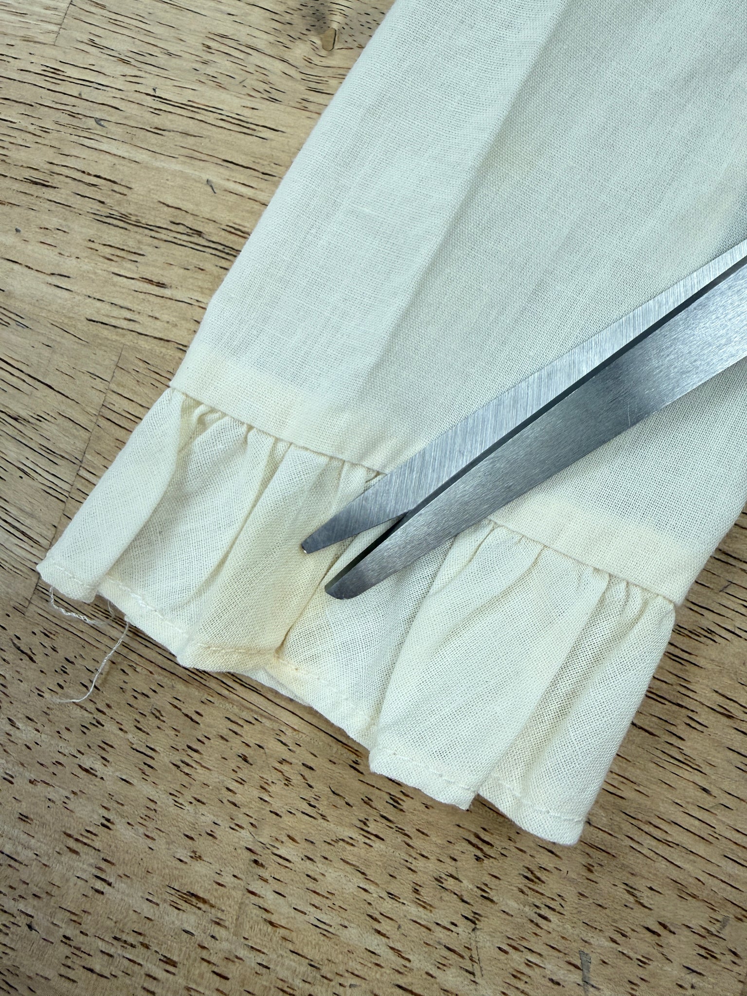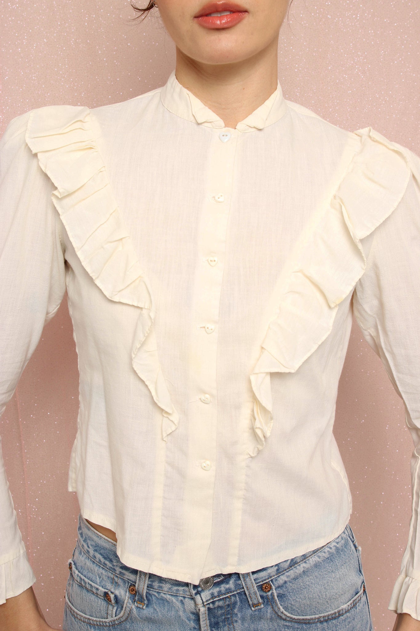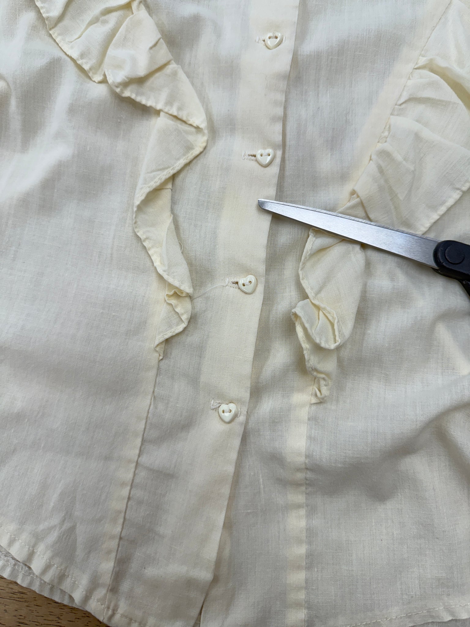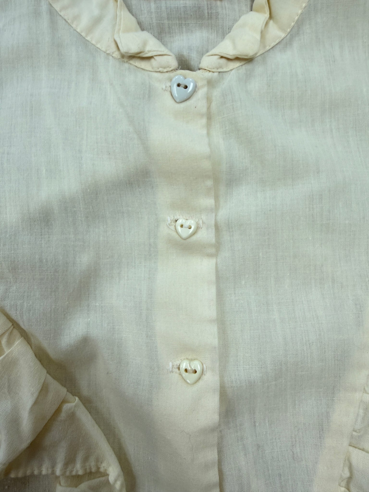 Good vintage condition: top heart button is slightly different than the others; faint spot on right sleeve cuff and center of the waist; small repair at the back of the left underarm.