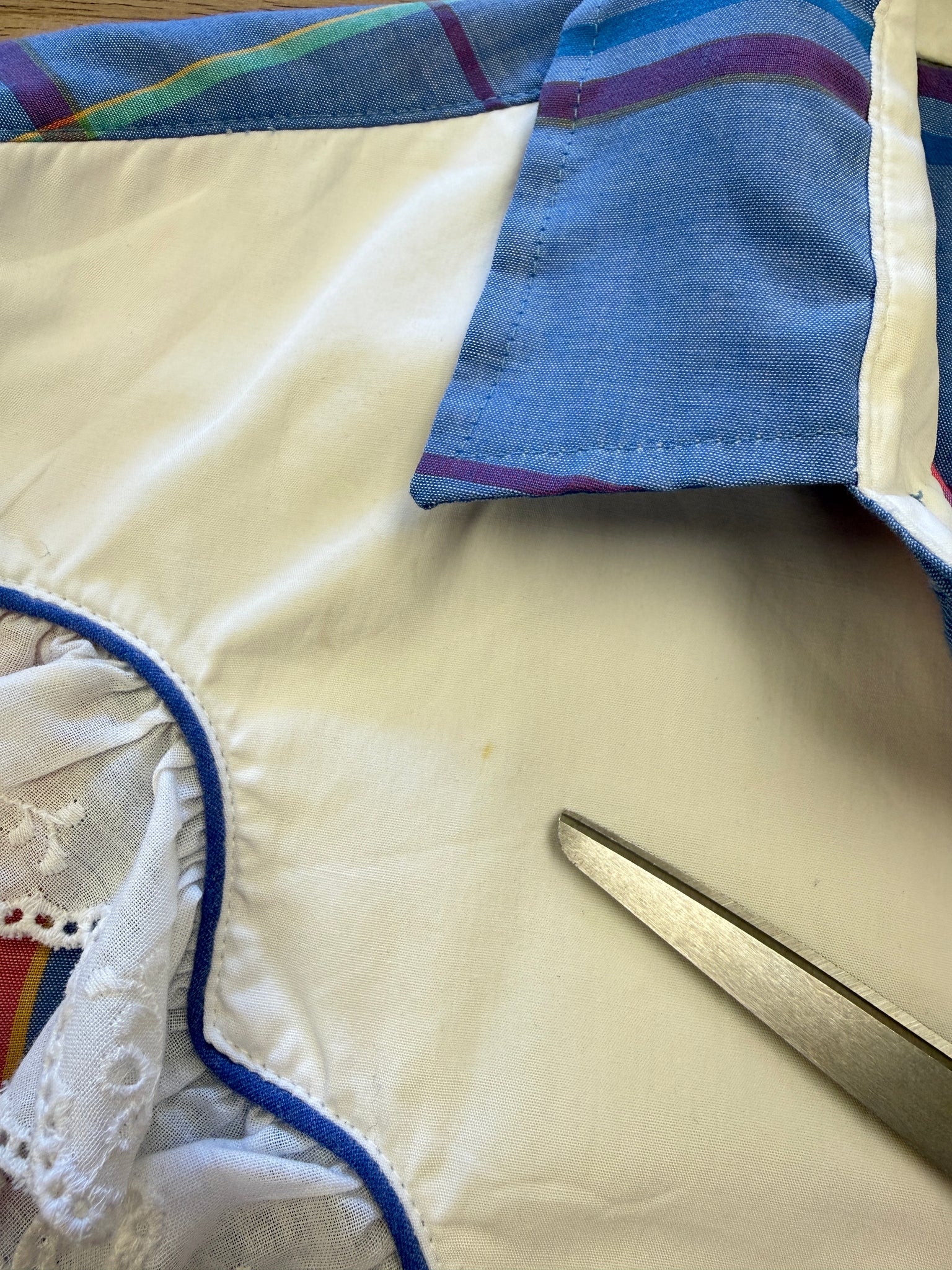 Great vintage condition: a few super faint pinprick marks on the white bib portion; a few faint markings on these sleeves and most notably on the left sleeve cuff area.