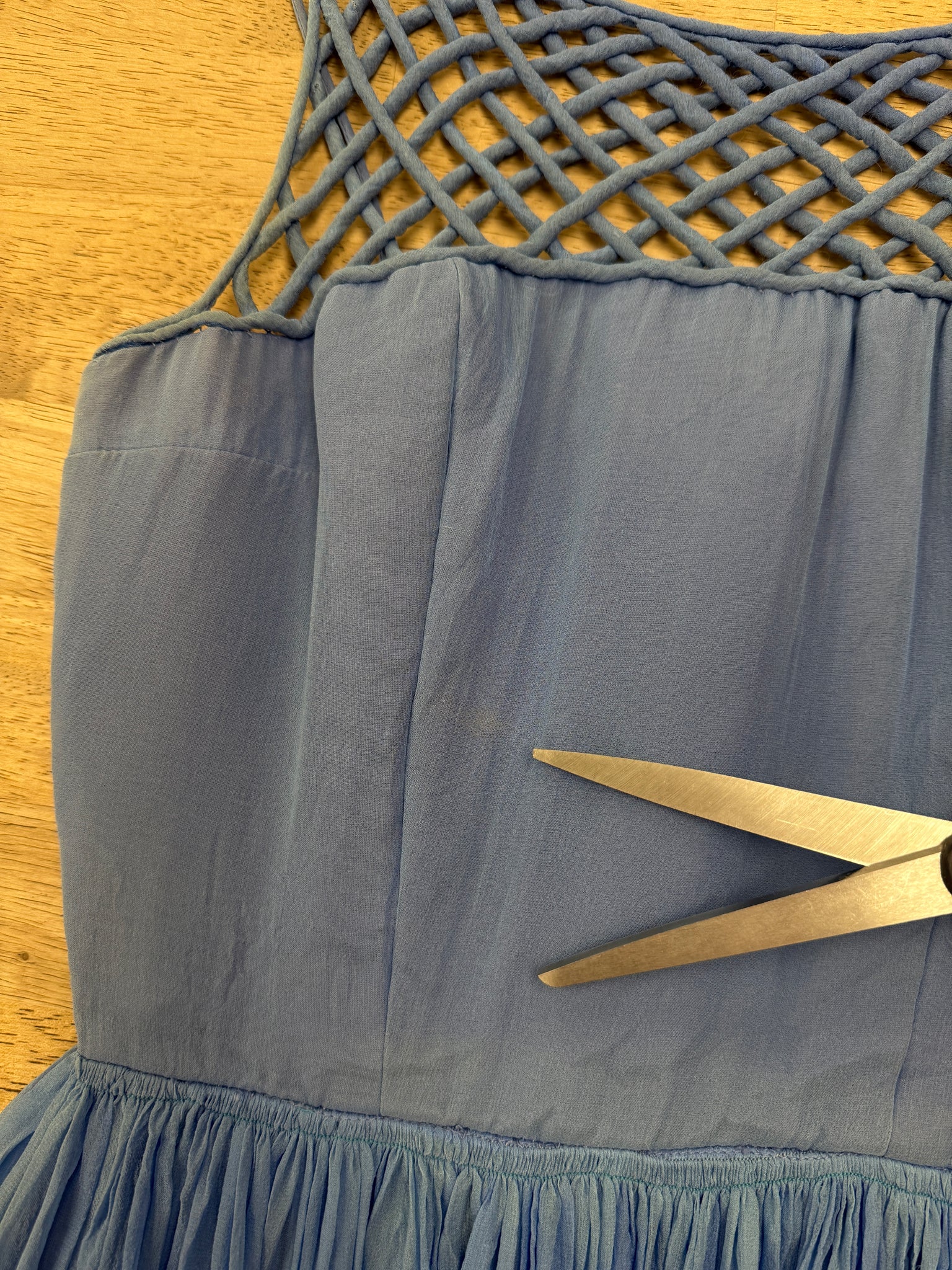 - Intricate woven lattice-like detail across the neckline