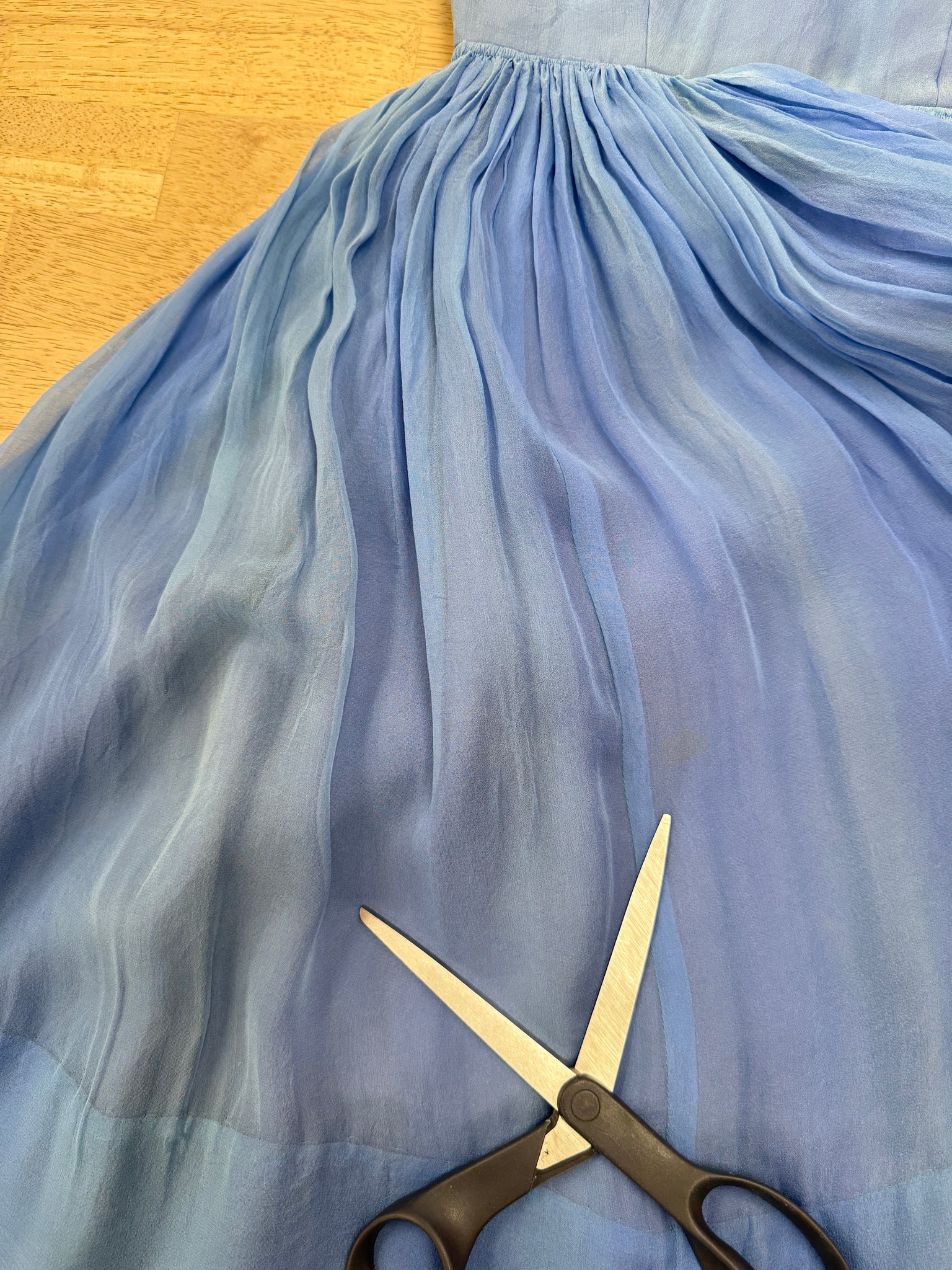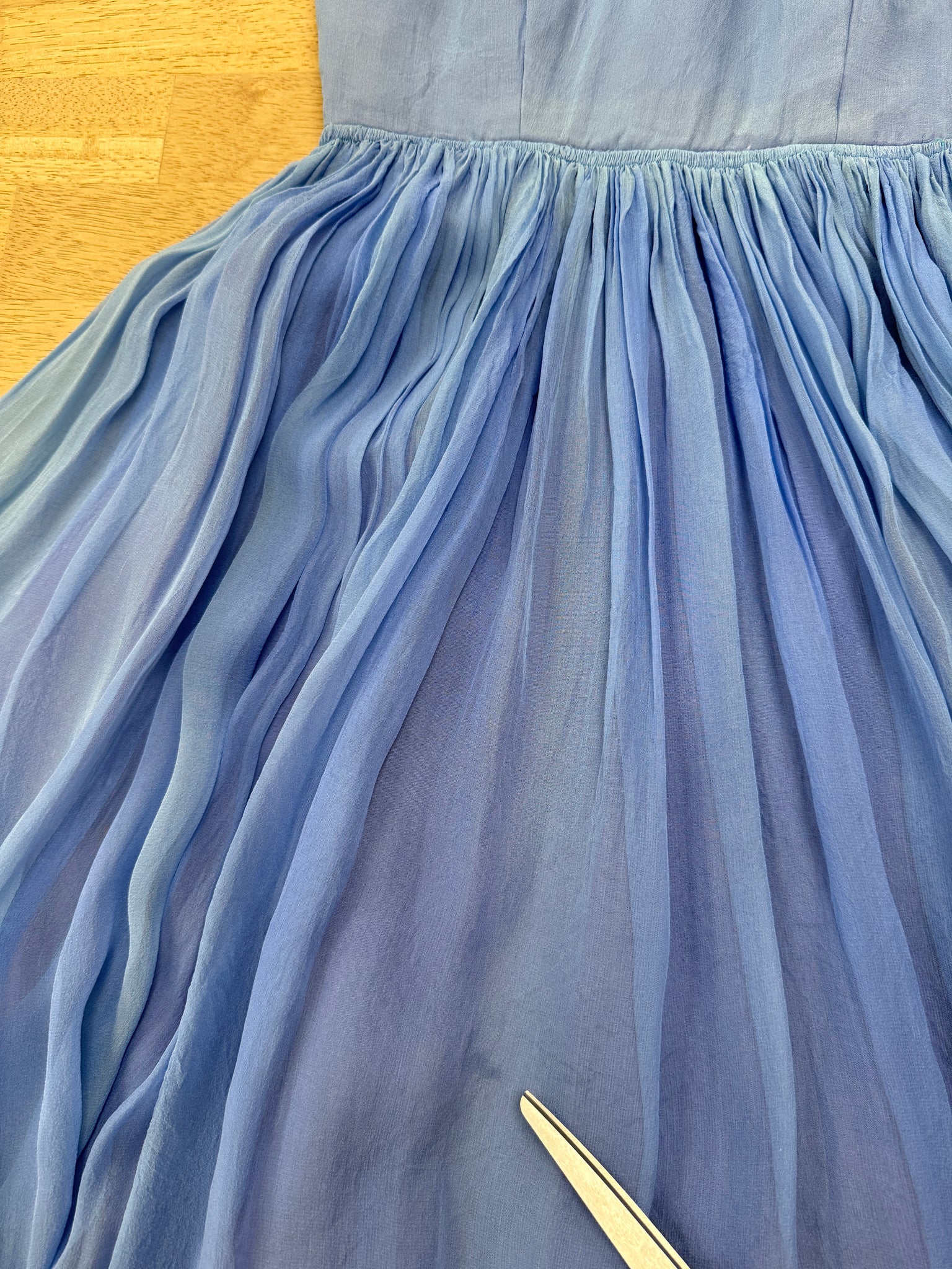 Good as-is vintage condition: some fading throughout the chiffon; a few small and faint markings; bottom hem of the lining peeks out just a tiny bit.