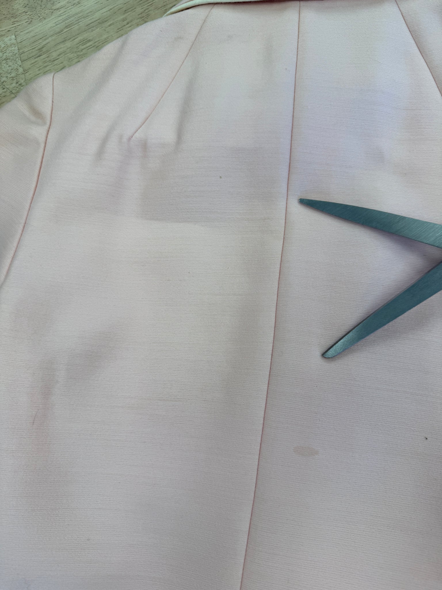 Good vintage condition: minor wear in the fabric on the top of the right shoulder, on the inside of the collar and on a few spots of the jacket; some light markings on the fabric.