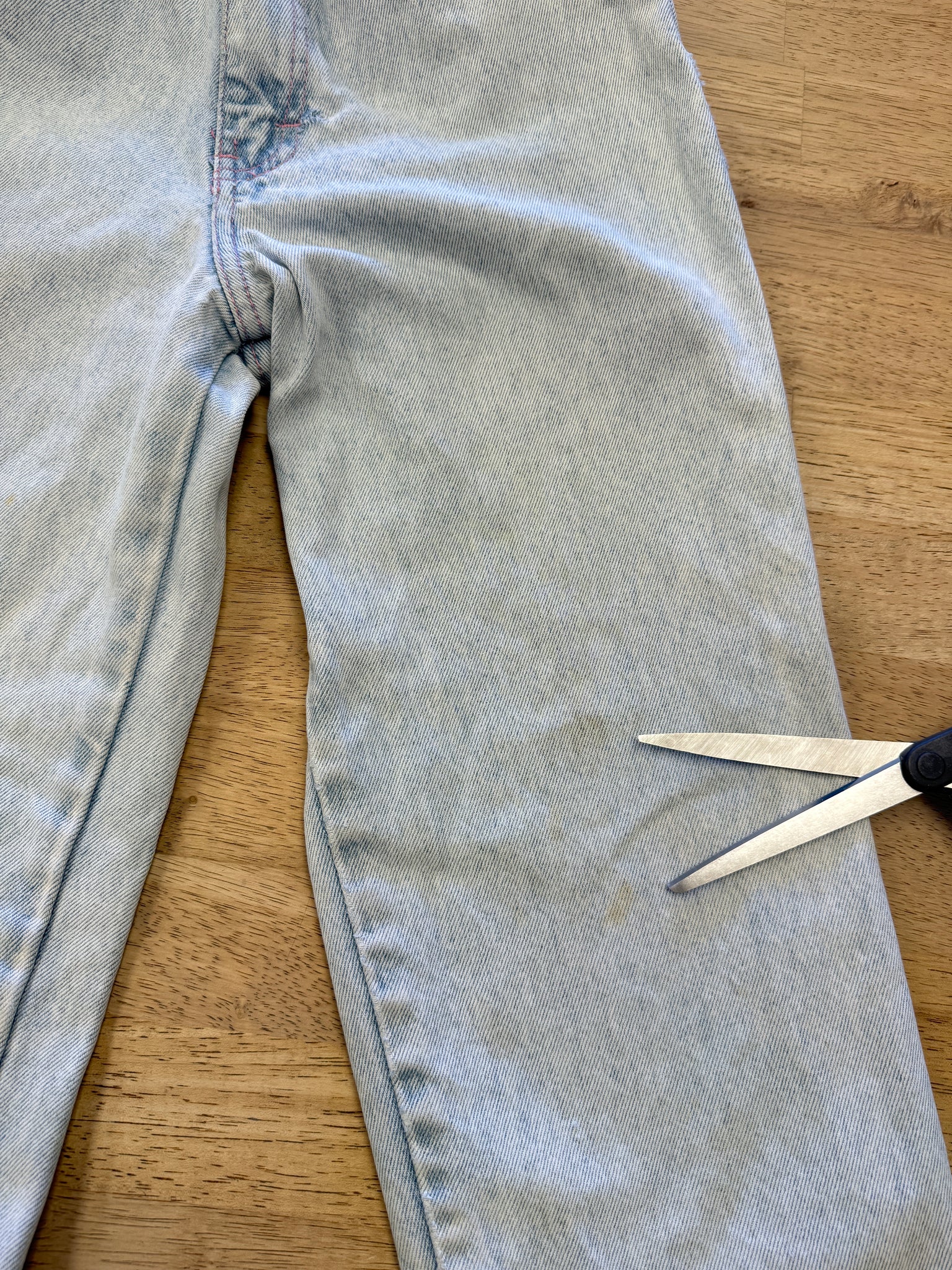 Great vintage condition: super light and small markings on the left thigh; bottom hems are frayed.