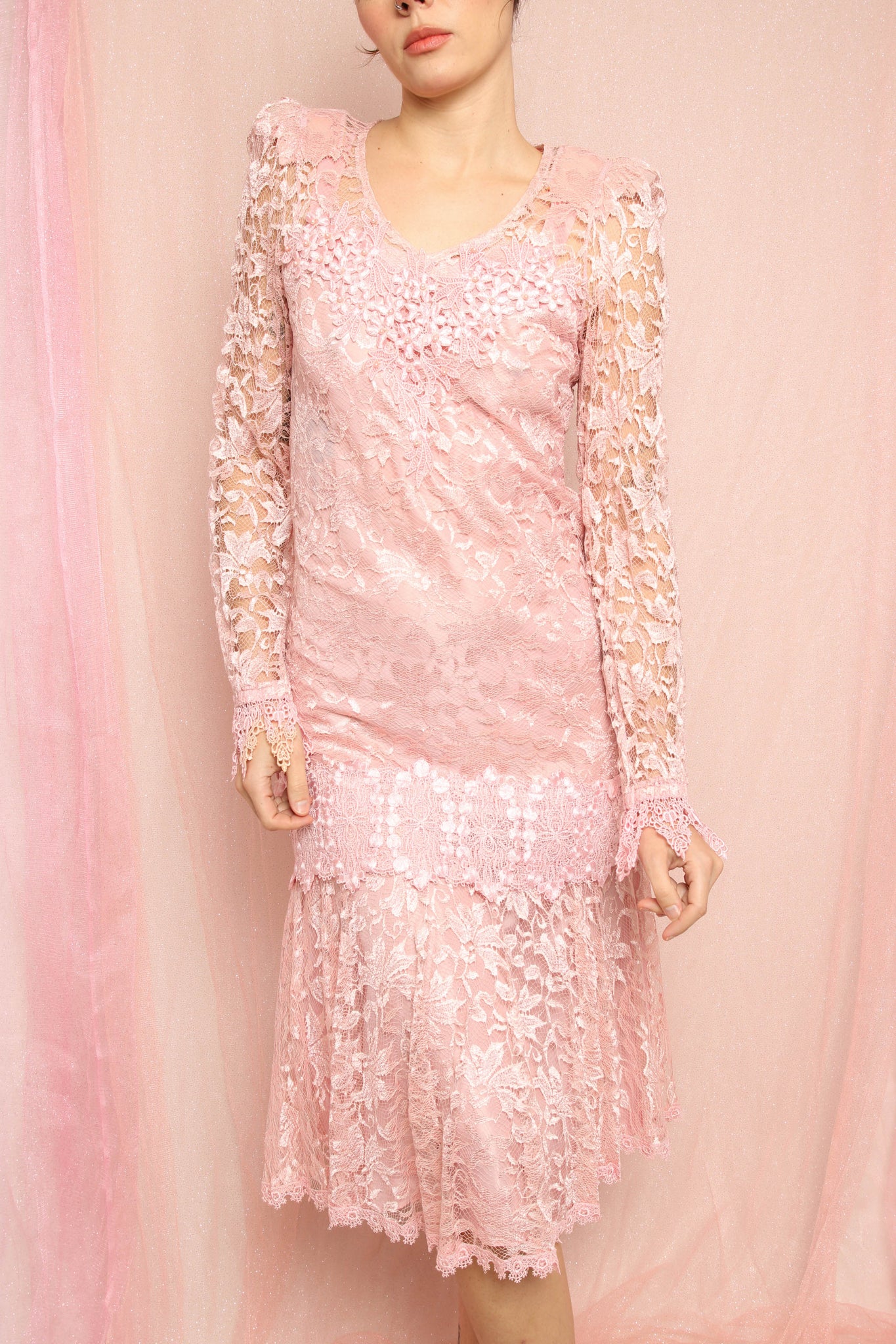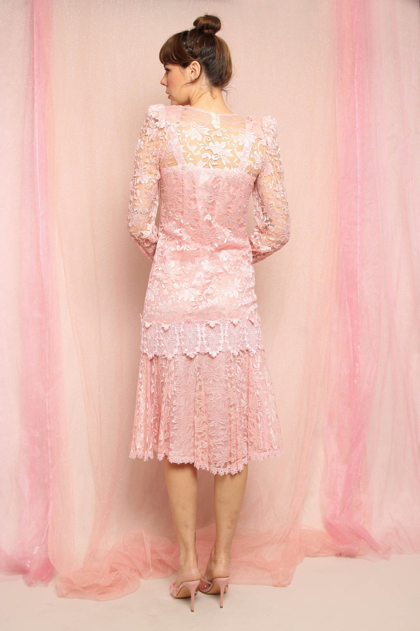 Good vintage condition: some discoloration on the lace on the right sleeve cuff and edge of the bottom hem of the skirt.
